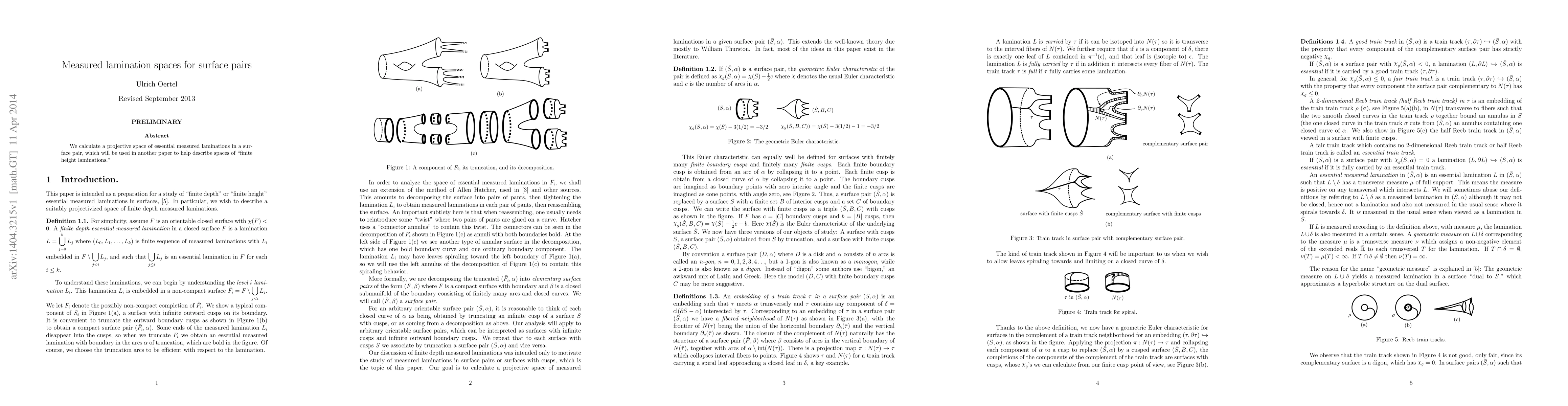 We calculate a projective space of essential measured laminations in a surface pair, which will be used in another paper to help describe spaces of "finite height laminations."