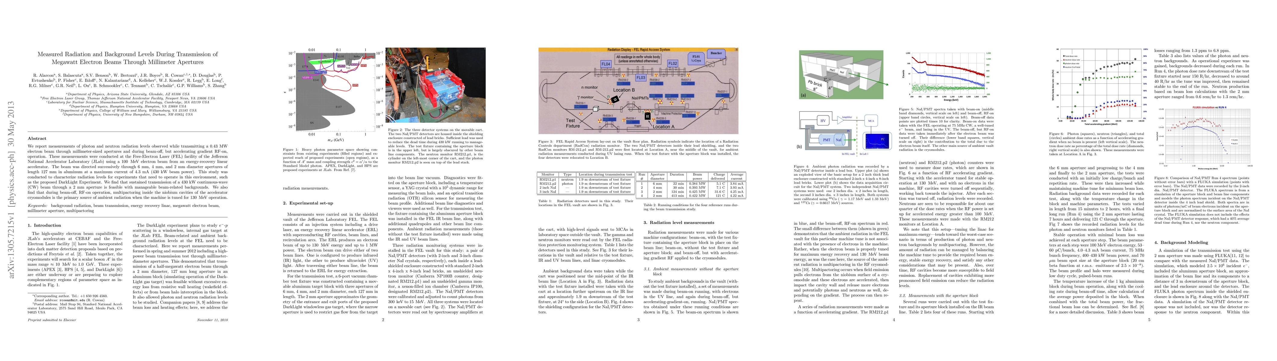 We report measurements of photon and neutron radiation levels observed while transmitting a 0.43 MW electron beam through millimeter-sized apertures and during beam-off, but accelerating gradient RF-on, operation. These measurements were conducted at the Free-Electron Laser (FEL) facility of the Jefferson National Accelerator Laboratory (JLab) using a 100 MeV electron beam from an energy-recovery linear accelerator. The beam was directed successively through 6 mm, 4 mm, and 2 mm diameter apertures of length 127 mm in aluminum at a maximum current of 4.3 mA (430 kW beam power). This study was conducted to characterize radiation levels for experiments that need to operate in this environment, such as the proposed DarkLight Experiment. We find that sustained transmission of a 430 kW continuous-wave (CW) beam through a 2 mm aperture is feasible with manageable beam-related backgrounds. We also find that during beam-off, RF-on operation, multipactoring inside the niobium cavities of the accelerator cryomodules is the primary source of ambient radiation when the machine is tuned for 130 MeV operation.