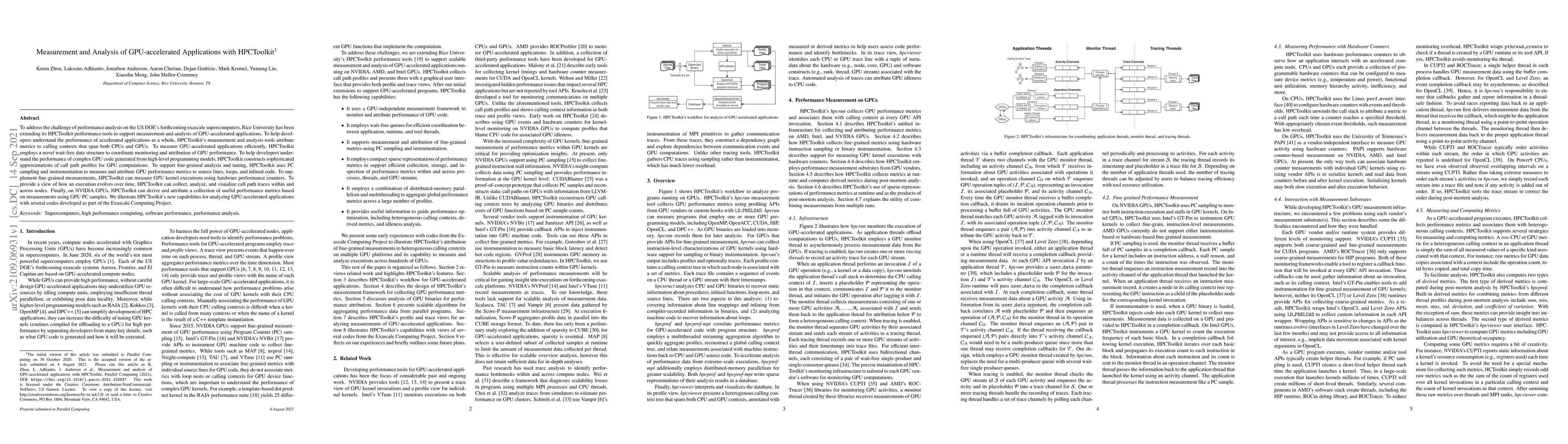HPCToolkit is extended to support performance analysis of GPU-accelerated applications, employing novel wait-free data structures and sophisticated call path profiles for comprehensive GPU performance measurement and visualization. The tool aids developers in fine-grained analysis and tuning of GPU code using PC sampling, instrumentation, and hardware performance counters.