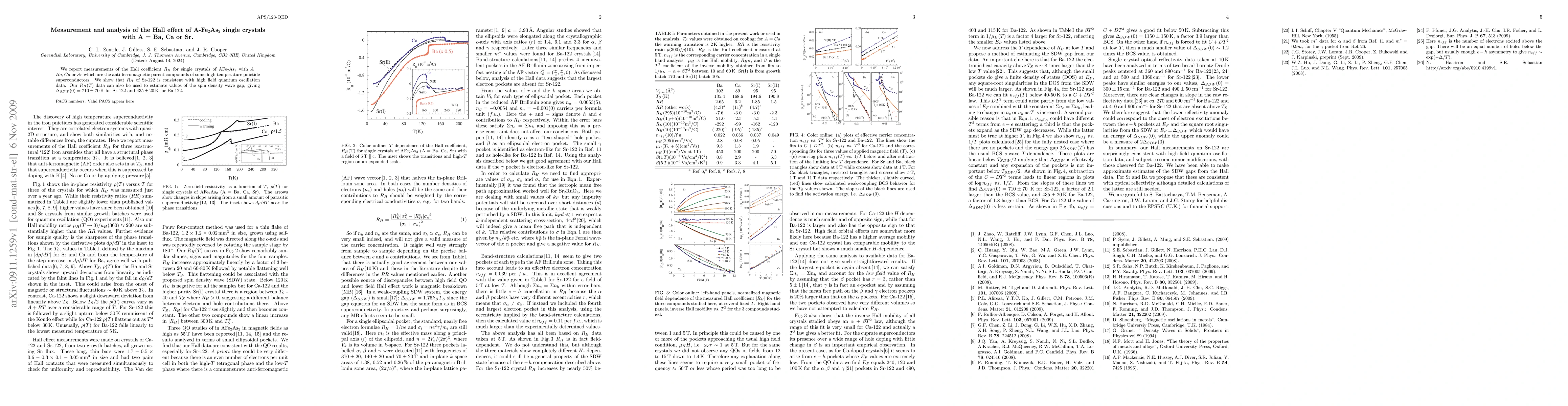 This study measures the Hall coefficient $R_H$ in single crystals of A-Fe$_2$As$_2$ (where A = Ba, Ca, or Sr), revealing that Sr-122's $R_H$ aligns with quantum oscillation data. Additionally, $R_H(T)$ data estimates spin density wave gap values of 710±70 K for Sr-122 and 435±20 K for Ba-122.