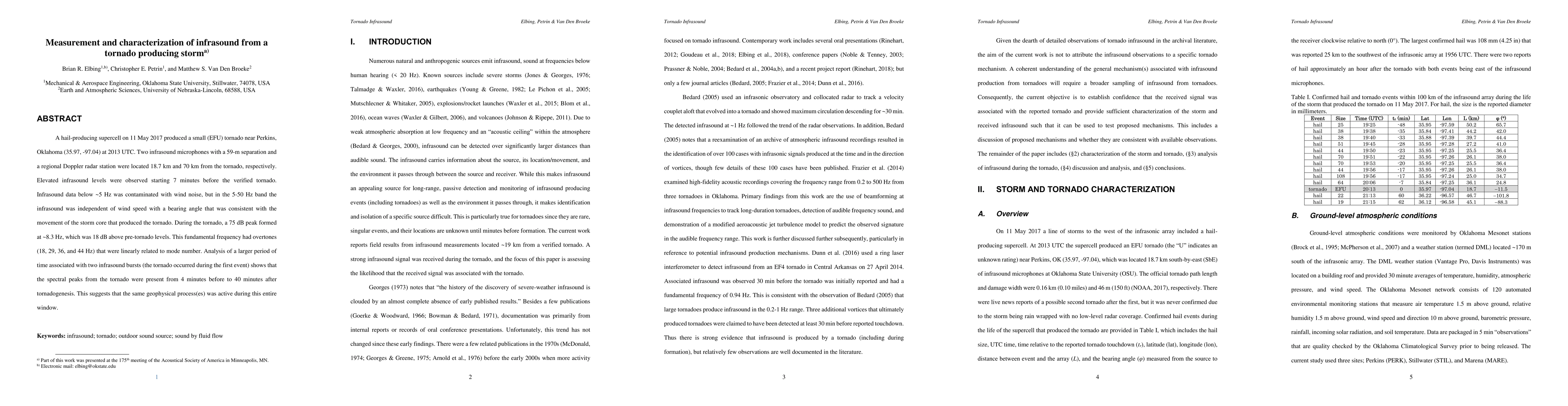 A hail-producing supercell on 11 May 2017 produced a small (EFU) tornado near Perkins, Oklahoma (35.97, -97.04) at 2013 UTC. Two infrasound microphones with a 59-m separation and a regional Doppler radar station were located 18.7 km and 70 km from the tornado, respectively. Elevated infrasound levels were observed starting 7 minutes before the verified tornado. Infrasound data below ~5 Hz was contaminated with wind noise, but in the 5-50 Hz band the infrasound was independent of wind speed with a bearing angle that was consistent with the movement of the storm core that produced the tornado. During the tornado, a 75 dB peak formed at ~8.3 Hz, which was 18 dB above pre-tornado levels. This fundamental frequency had overtones (18, 29, 36, and 44 Hz) that were linearly related to mode number. Analysis of a larger period of time associated with two infrasound bursts (the tornado occurred during the first event) shows that the spectral peaks from the tornado were present from 4 minutes before to 40 minutes after tornadogenesis. This suggests that the same geophysical process(es) was active during this entire window.
