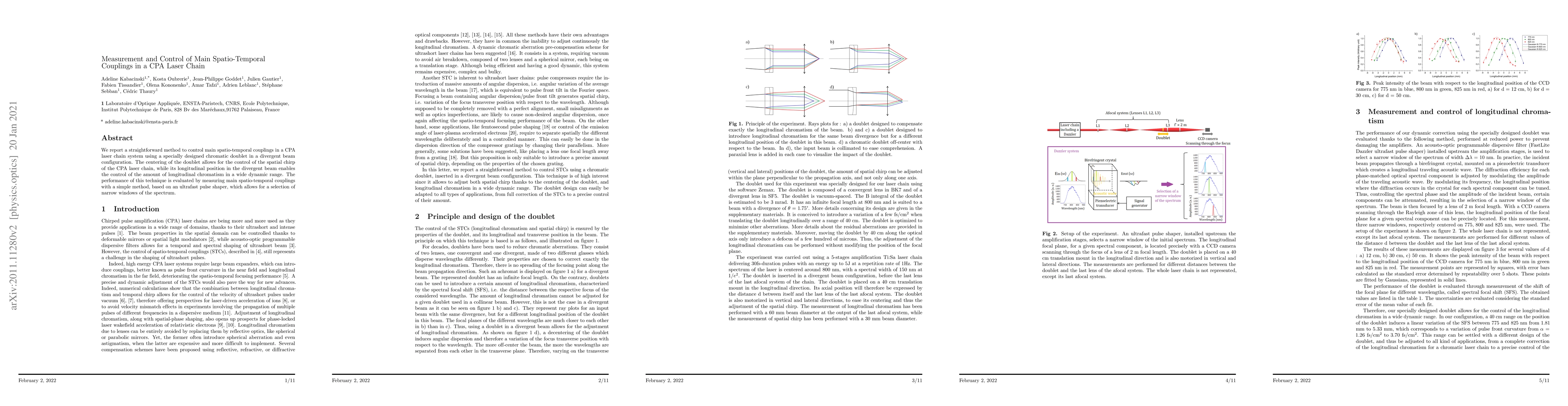 This paper presents a method to control the main spatio-temporal couplings in a CPA laser chain using a specially designed chromatic doublet in a divergent beam configuration. The technique allows precise control over spatial chirp and longitudinal chromatism, evaluated through measurements using an ultrafast pulse shaper.