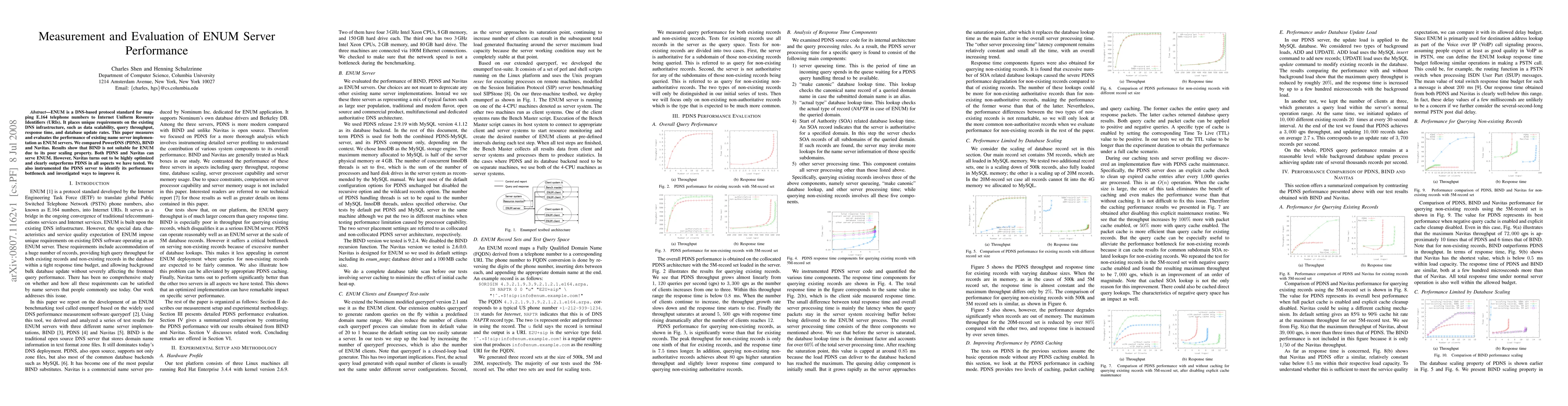 This paper evaluates the performance of ENUM servers using PowerDNS, BIND, and Navitas, finding that BIND lacks scalability for ENUM. Navitas is highly optimized and outperforms PowerDNS in all tested aspects, while PowerDNS's performance bottlenecks were identified and potential improvements discussed.