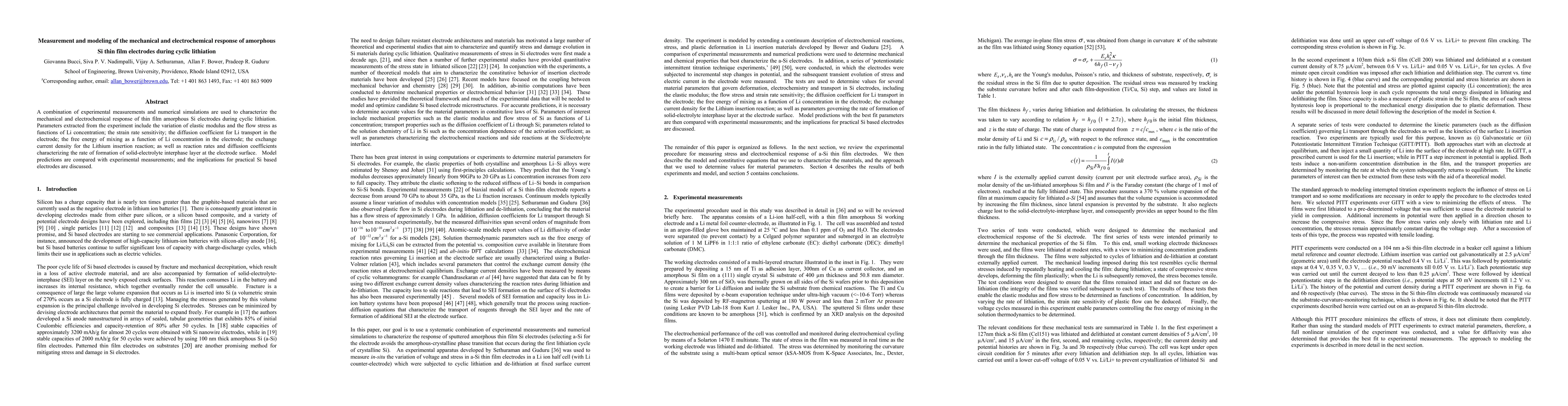 This paper combines experimental measurements and numerical simulations to characterize the mechanical and electrochemical behavior of thin film amorphous Si electrodes during cyclic lithiation, extracting key parameters like elastic modulus, flow stress, and diffusion coefficients. Model predictions are validated against experimental data, with implications for the design of practical Si-based electrodes discussed.
