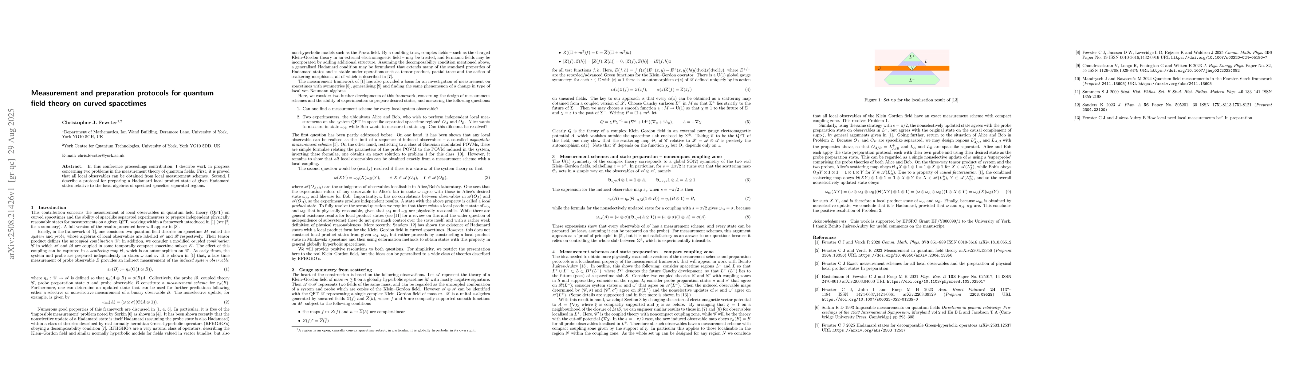 In this conference proceedings contribution, I describe work in progress concerning two problems in the measurement theory of quantum fields. First, it is proved that all local observables can be obtained from local measurement schemes. Second, I describe a protocol for preparing a Hadamard local product state of given Hadamard states relative to the local algebras of specified spacelike separated regions.