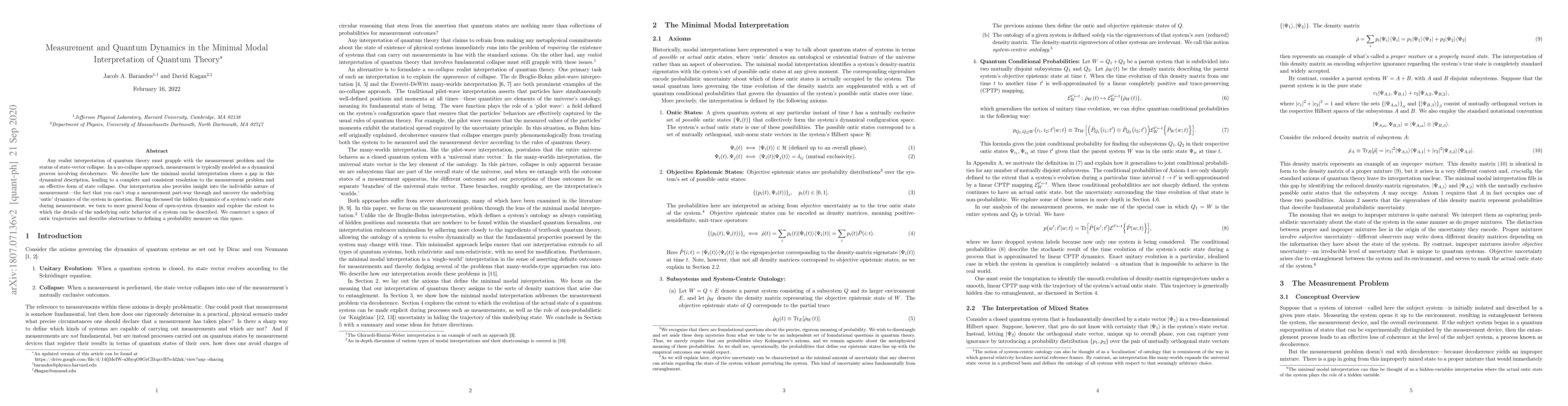This paper proposes a minimal modal interpretation of quantum theory that resolves the measurement problem through a no-collapse dynamical approach, emphasizing the indivisible nature of measurement and exploring the hidden ontic dynamics of systems, while also discussing the limitations of defining a probability measure on the space of ontic trajectories.