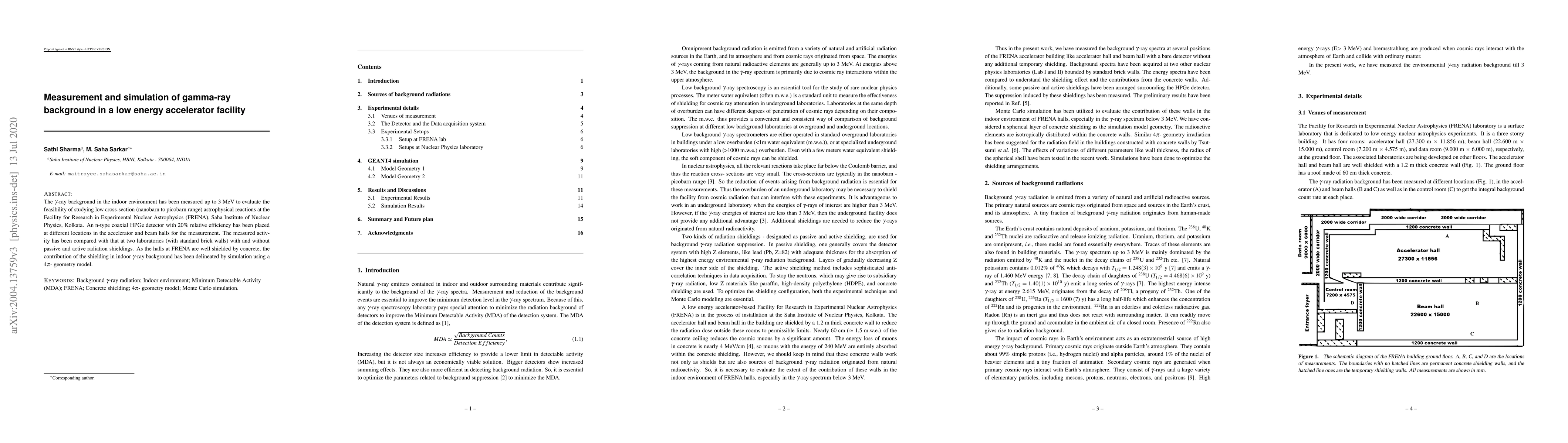 The gamma-ray background in the indoor environment has been measured up to 3 MeV to evaluate the feasibility of studying low cross-section (nanobarn to picobarn range) astrophysical reactions at the Facility for Research in Experimental Nuclear Astrophysics (FRENA), Saha Institute of Nuclear Physics, Kolkata. An n-type coaxial HPGe detector with 20% relative efficiency has been placed at different locations in the accelerator and beam halls for the measurement. The measured activity has been compared with that at two laboratories (with standard brick walls) with and without passive and active radiation shielding. As the halls at FRENA are well shielded by concrete, the contribution of the shielding in indoor gamma-ray background has been delineated by simulation using a 4p-geometry model.