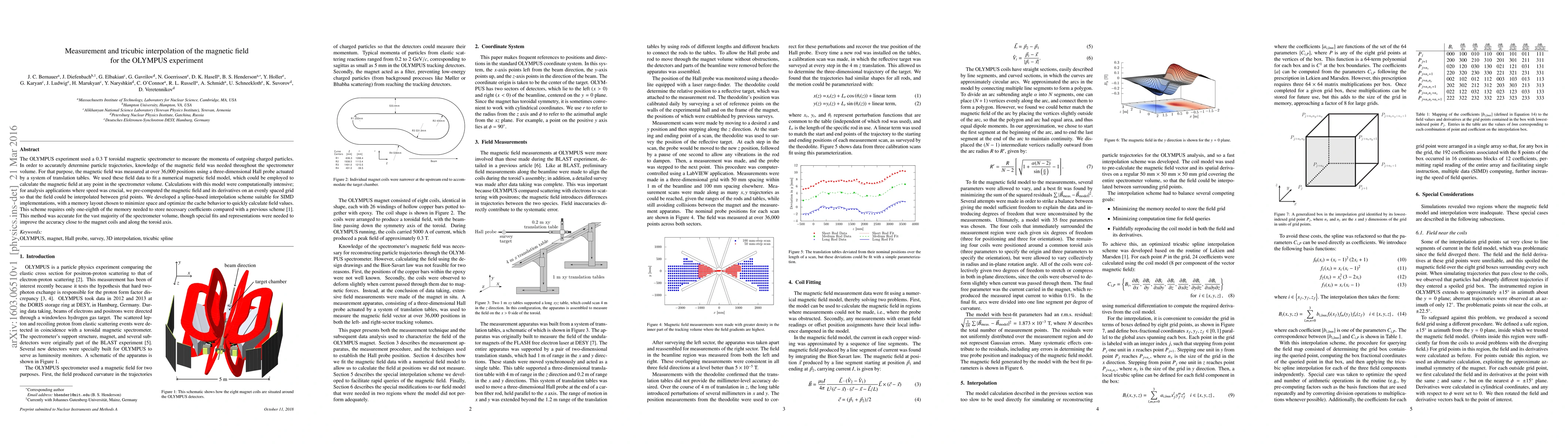 The OLYMPUS experiment used a 0.3 T toroidal magnetic spectrometer to measure the momenta of outgoing charged particles. In order to accurately determine particle trajectories, knowledge of the magnetic field was needed throughout the spectrometer volume. For that purpose, the magnetic field was measured at over 36,000 positions using a three-dimensional Hall probe actuated by a system of translation tables. We used these field data to fit a numerical magnetic field model, which could be employed to calculate the magnetic field at any point in the spectrometer volume. Calculations with this model were computationally intensive; for analysis applications where speed was crucial, we pre-computed the magnetic field and its derivatives on an evenly spaced grid so that the field could be interpolated between grid points. We developed a spline-based interpolation scheme suitable for SIMD implementations, with a memory layout chosen to minimize space and optimize the cache behavior to quickly calculate field values. This scheme requires only one-eighth of the memory needed to store necessary coefficients compared with a previous scheme [1]. This method was accurate for the vast majority of the spectrometer volume, though special fits and representations were needed to improve the accuracy close to the magnet coils and along the toroid axis.
