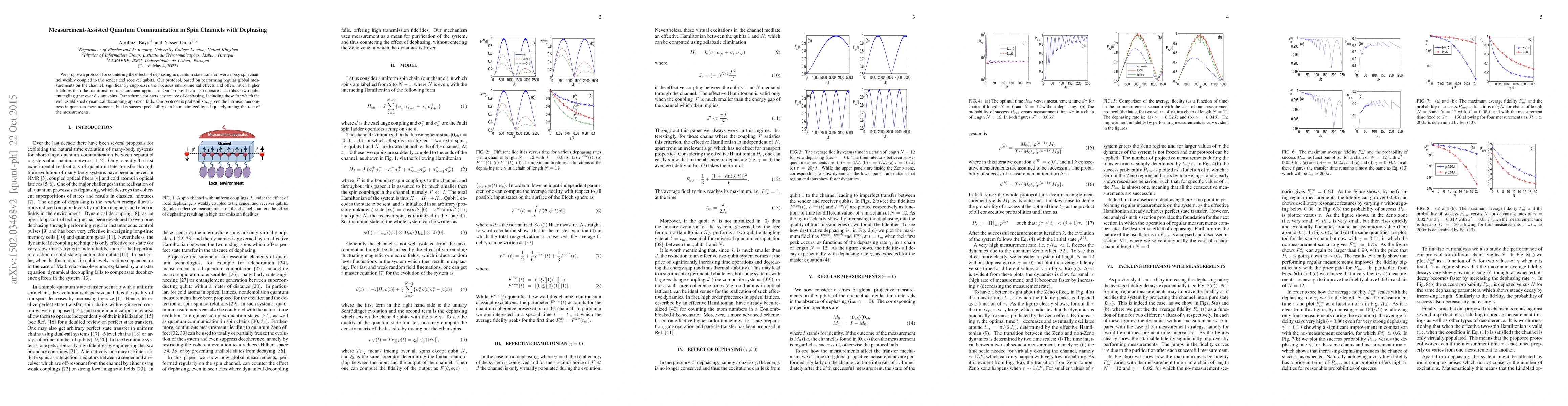 We propose a protocol for countering the effects of dephasing in quantum state transfer over a noisy spin channel weakly coupled to the sender and receiver qubits. Our protocol, based on performing regular global measurements on the channel, significantly suppresses the nocuous environmental effects and offers much higher fidelities than the traditional no-measurement approach. Our proposal can also operate as a robust two-qubit entangling gate over distant spins. Our scheme counters any source of dephasing, including those for which the well established dynamical decoupling approach fails. Our protocol is probabilistic, given the intrinsic randomness in quantum measurements, but its success probability can be maximized by adequately tuning the rate of the measurements.