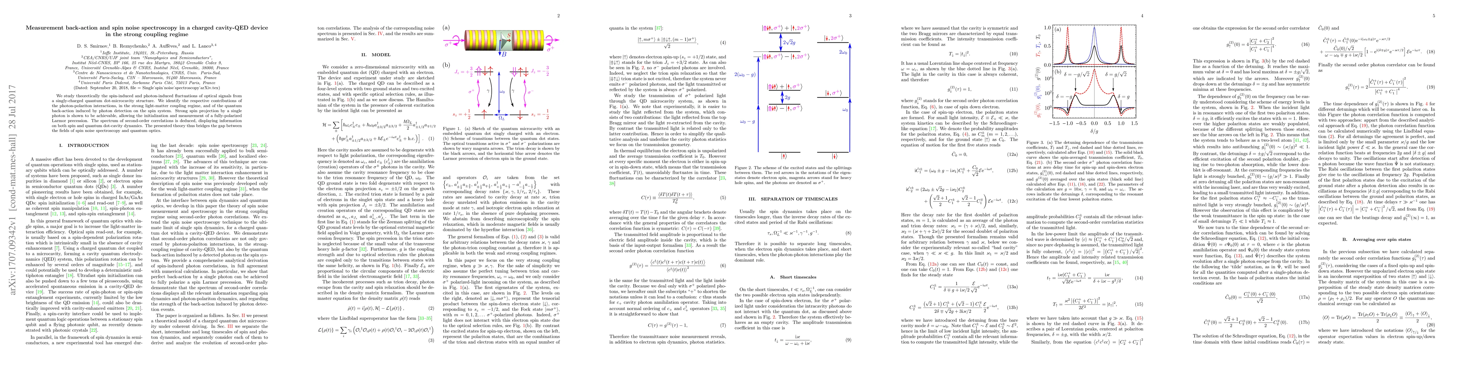 This paper explores the spin-induced and photon-induced fluctuations in a charged cavity-QED system, identifying contributions from photon-polariton interactions and quantum back-action from photon detection. It demonstrates strong spin projection by a single photon, enabling the initialization and measurement of fully-polarized Larmor precession, and bridges the gap between spin noise spectroscopy and quantum optics.