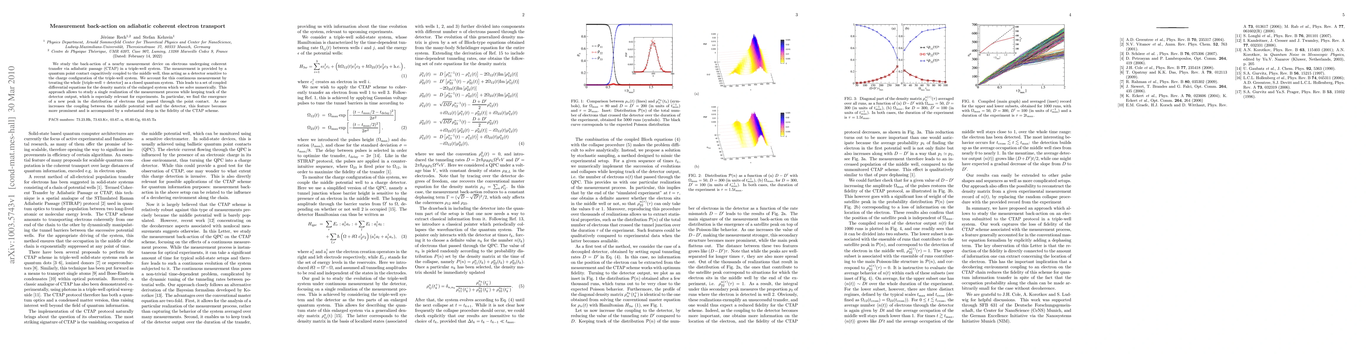 We study the back-action of a nearby measurement device on electrons undergoing coherent transfer via adiabatic passage (CTAP) in a triple-well system. The measurement is provided by a quantum point contact capacitively coupled to the middle well, thus acting as a detector sensitive to the charge configuration of the triple-well system. We account for this continuous measurement by treating the whole {triple-well + detector} as a closed quantum system. This leads to a set of coupled differential equations for the density matrix of the enlarged system which we solve numerically. This approach allows to study a single realization of the measurement process while keeping track of the detector output, which is especially relevant for experiments. In particular, we find the emergence of a new peak in the distribution of electrons that passed through the point contact. As one increases the coupling between the middle potential well and the detector, this feature becomes more prominent and is accompanied by a substantial drop in the fidelity of the CTAP scheme.