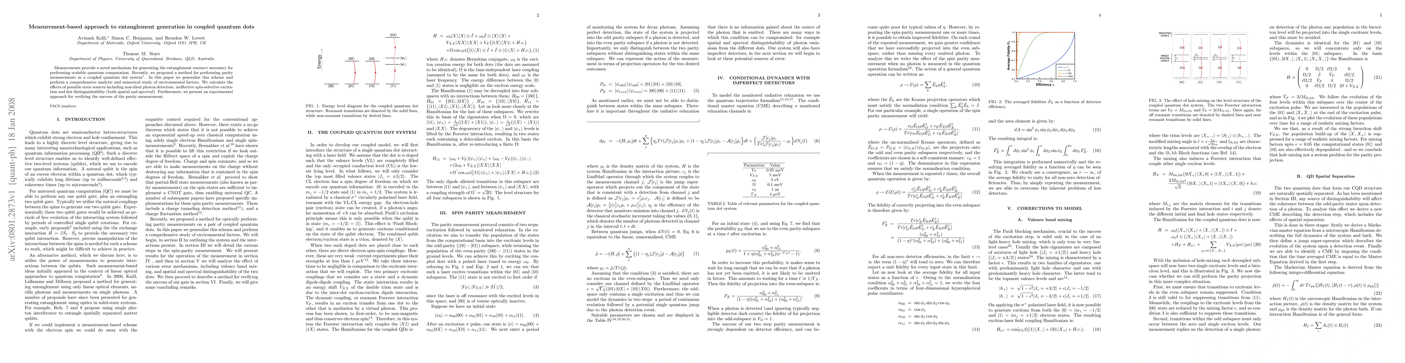 Measurements provide a novel mechanism for generating the entanglement resource necessary for performing scalable quantum computation. Recently, we proposed a method for performing parity measurements in a coupled quantum dot system. In this paper we generalise this scheme and perform a comprehensive analytic and numerical study of environmental factors. We calculate the effects of possible error sources including non-ideal photon detectors, ineffective spin-selective excitation and dot distinguishability (both spatial and spectral). Furthermore, we present an experimental approach for verifying the success of the parity measurement.