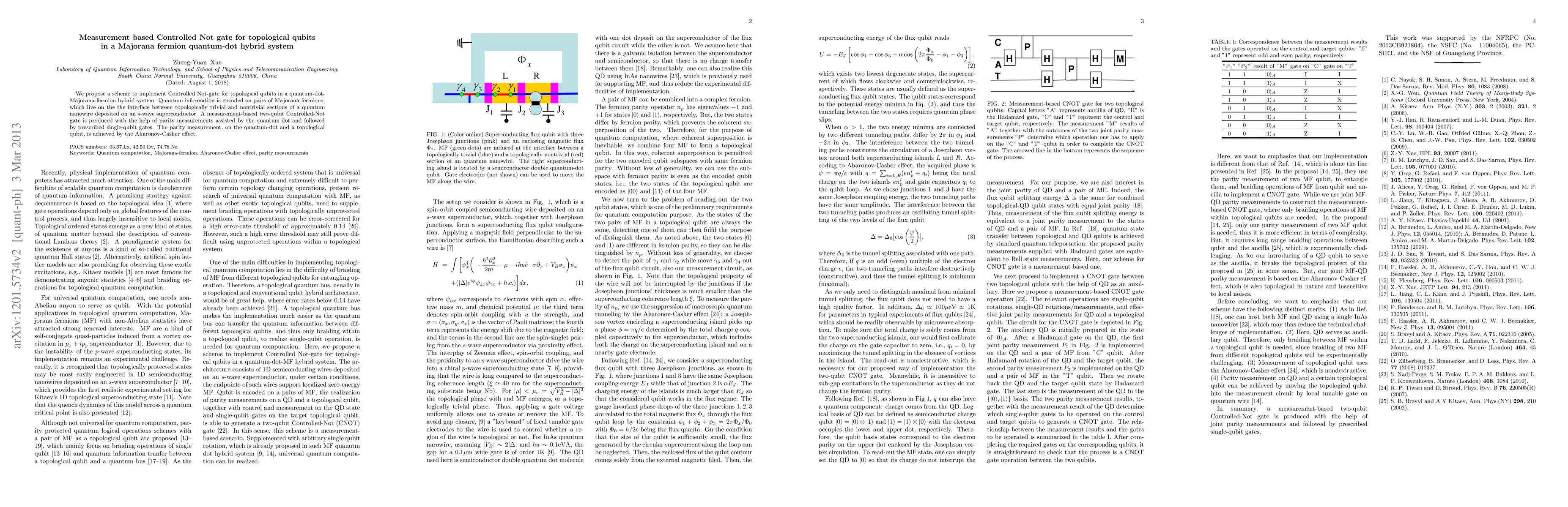 This paper proposes a scheme for implementing a Controlled Not gate using a quantum-dot-Majorana fermion hybrid system, where topological qubits are encoded in pairs of Majorana fermions. The gate is realized through parity measurements assisted by the quantum dot and subsequent single-qubit operations, leveraging the Aharonov-Casher effect.