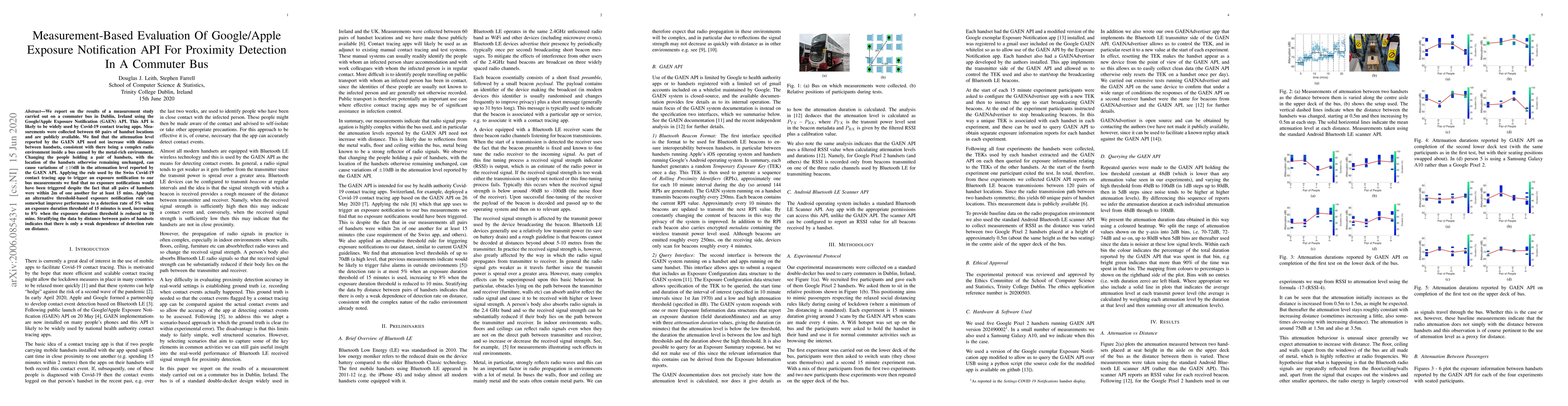 We report on the results of a measurement study carried out on a commuter bus in Dublin, Ireland using the Google/Apple Exposure Notification (GAEN) API. This API is likely to be widely used by Covid-19 contact tracing apps. Measurements were collected between 60 pairs of handset locations and are publicly available. We find that the attenuation level reported by the GAEN API need not increase with distance between handsets, consistent with there being a complex radio environment inside a bus caused by the metal-rich environment. Changing the people holding a pair of handsets, with the location of the handsets otherwise remaining unchanged, can cause variations of +/-10dB in the attenuation level reported by the GAEN API. Applying the rule used by the Swiss Covid-19 contact tracing app to trigger an exposure notification to our bus measurements we find that no exposure notifications would have been triggered despite the fact that all pairs of handsets were within 2m of one another for at least 15 mins. Applying an alternative threshold-based exposure notification rule can somewhat improve performance to a detection rate of 5% when an exposure duration threshold of 15 minutes is used, increasing to 8% when the exposure duration threshold is reduced to 10 mins. Stratifying the data by distance between pairs of handsets indicates that there is only a weak dependence of detection rate on distance.