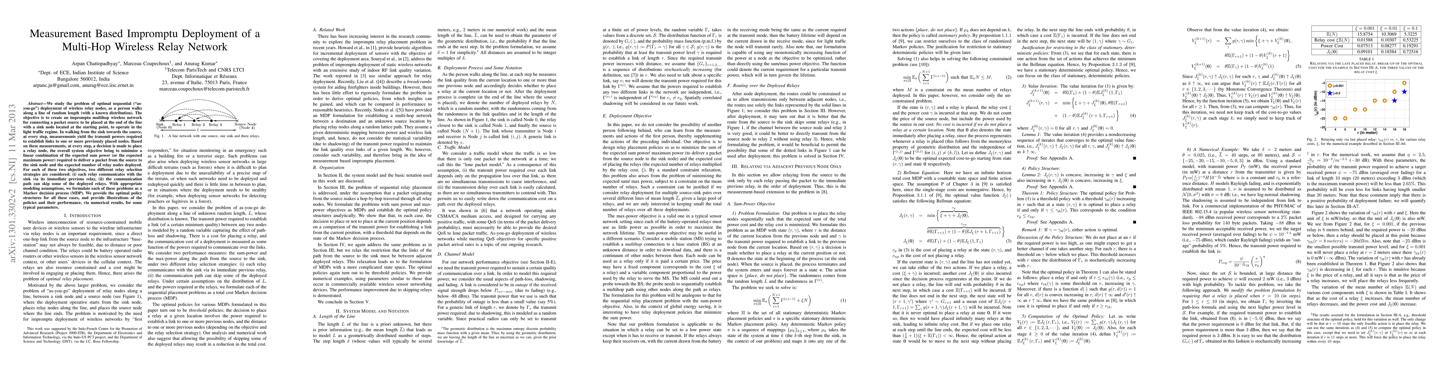 We study the problem of optimal sequential ("as-you-go") deployment of wireless relay nodes as a person walks along a line of random length (with a known distribution). The objective is to create an impromptu multihop wireless network for connecting a packet source to be placed at the end of the line with a sink node located at the starting point, to operate in the light traffic regime. As the deployment person walks along the line from the sink towards the source, at every step, he measures the channel quality to one (or more) previously placed relays, and places the relay nodes based on these measurements, so as to minimize either the sum power or the maximum power from the source to the sink node in the resultant network, subject to a constraint on the expected number of relays placed. For each of these two objectives, two different relay selection strategies are considered: (i) each relay communicates with the sink via its immediate previous relay, (ii) the communication path can skip some of the deployed relays. With appropriate modeling assumptions, we formulate each of these problems as a Markov decision process (MDP). We provide the optimal policy structures for all these cases, and provide illustrations, via numerical results, for some typical parameters.