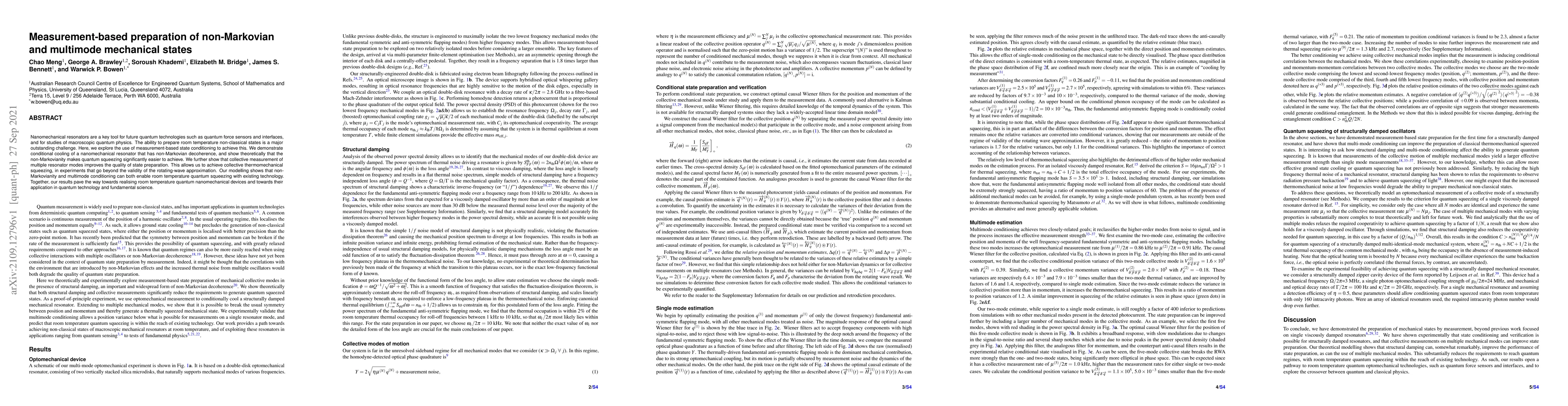 The research demonstrates the use of measurement-based state conditioning to prepare non-Markovian and multimode mechanical states at room temperature in nanomechanical resonators. This method, involving conditional cooling and collective measurement of multiple resonator modes, shows potential for achieving room temperature quantum squeezing with current technology, advancing quantum nanomechanical devices and their applications in quantum technology and fundamental science.
