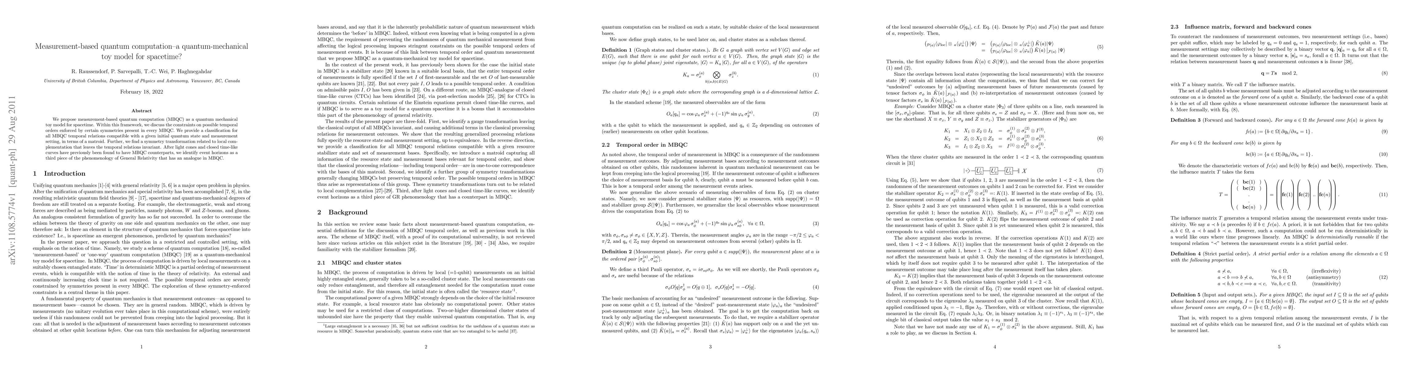 This paper proposes measurement-based quantum computation (MBQC) as a quantum mechanical toy model for spacetime, classifying temporal relations in terms of a matroid and identifying event horizons as a General Relativity analogue in MBQC. It also discusses symmetries and transformations that maintain MBQC temporal relations.