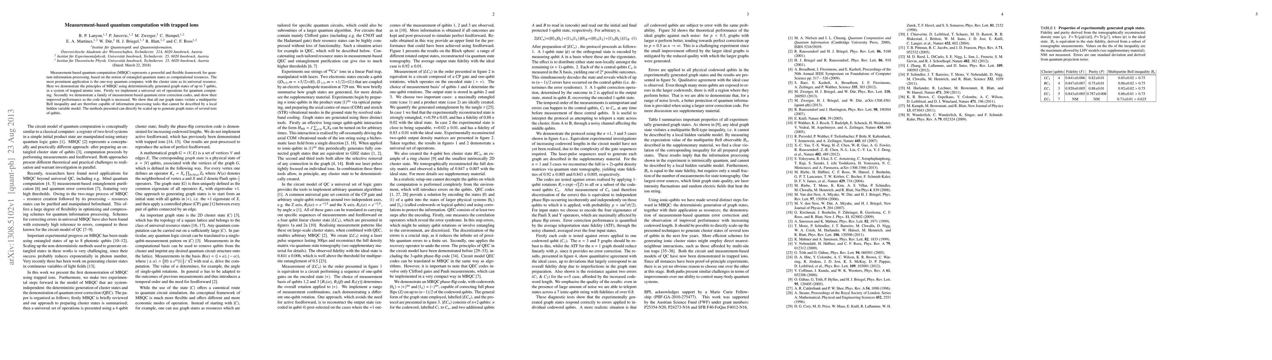This paper demonstrates measurement-based quantum computation using trapped atomic ions to generate graph states, implementing universal quantum operations and quantum error correction codes. The generated states violate multipartite Bell inequalities, indicating their capability for quantum information processing beyond classical limits.