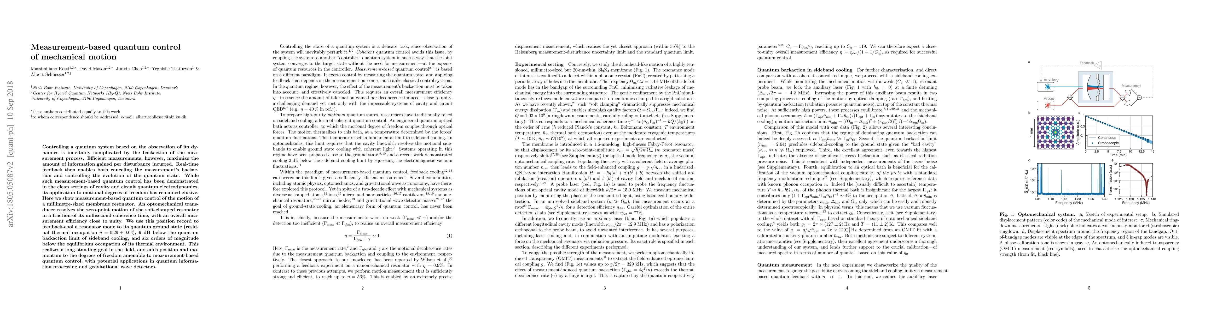 This paper demonstrates measurement-based quantum control of the motion of a millimetre-sized membrane resonator using an optomechanical transducer, achieving near-unity efficiency. The researchers successfully feedback-cool the resonator to its quantum ground state, significantly reducing thermal occupation and expanding the scope of quantum control to mechanical motion.