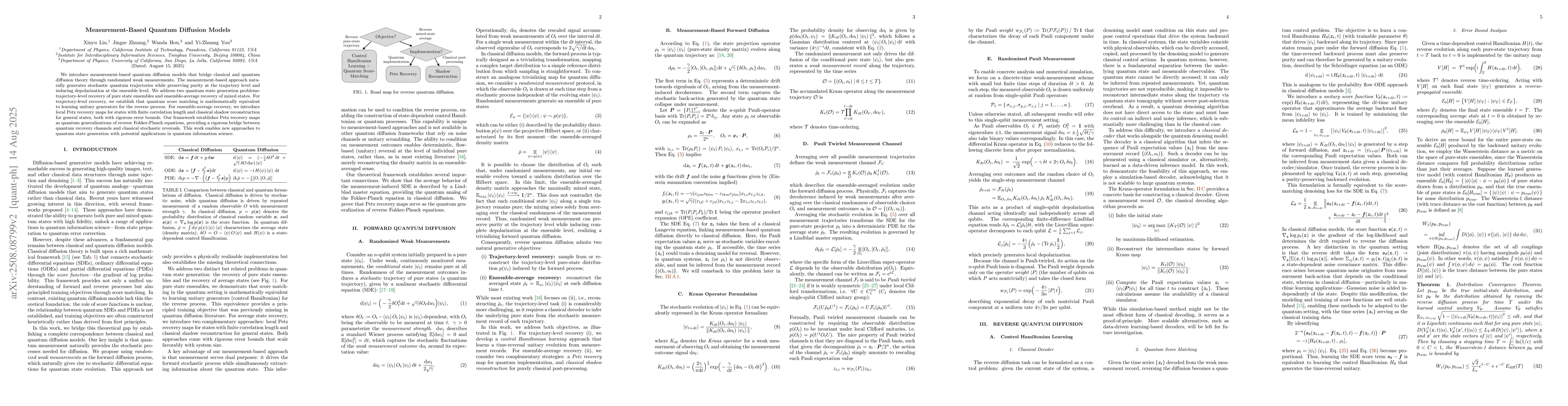 We introduce measurement-based quantum diffusion models that bridge classical and quantum diffusion theory through randomized weak measurements. The measurement-based approach naturally generates stochastic quantum trajectories while preserving purity at the trajectory level and inducing depolarization at the ensemble level. We address two quantum state generation problems: trajectory-level recovery of pure state ensembles and ensemble-average recovery of mixed states. For trajectory-level recovery, we establish that quantum score matching is mathematically equivalent to learning unitary generators for the reverse process. For ensemble-average recovery, we introduce local Petz recovery maps for states with finite correlation length and classical shadow reconstruction for general states, both with rigorous error bounds. Our framework establishes Petz recovery maps as quantum generalizations of reverse Fokker-Planck equations, providing a rigorous bridge between quantum recovery channels and classical stochastic reversals. This work enables new approaches to quantum state generation with potential applications in quantum information science.