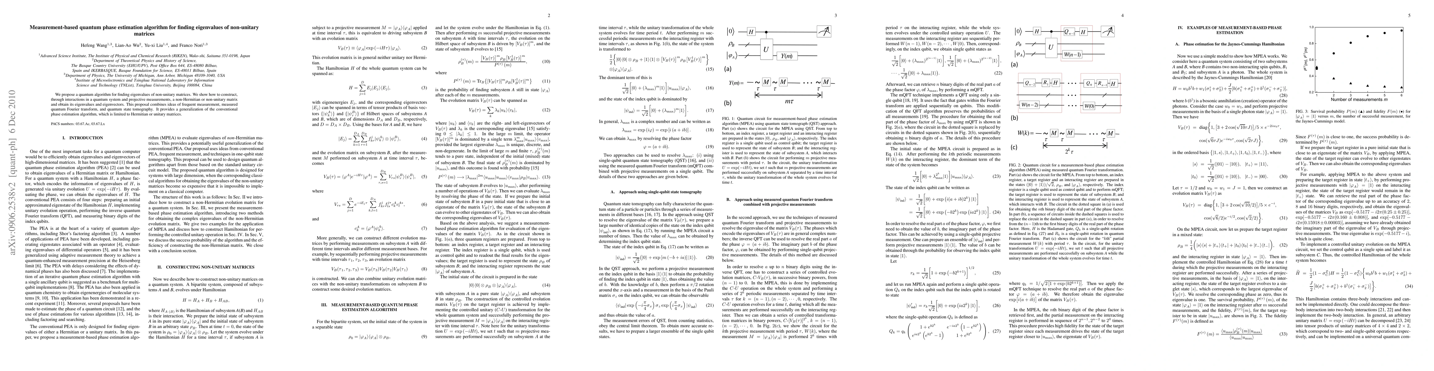 This paper proposes a quantum algorithm for determining eigenvalues of non-unitary matrices using measurement-based quantum phase estimation, combining frequent measurement, measured quantum Fourier transform, and quantum state tomography to generalize the conventional phase estimation method.