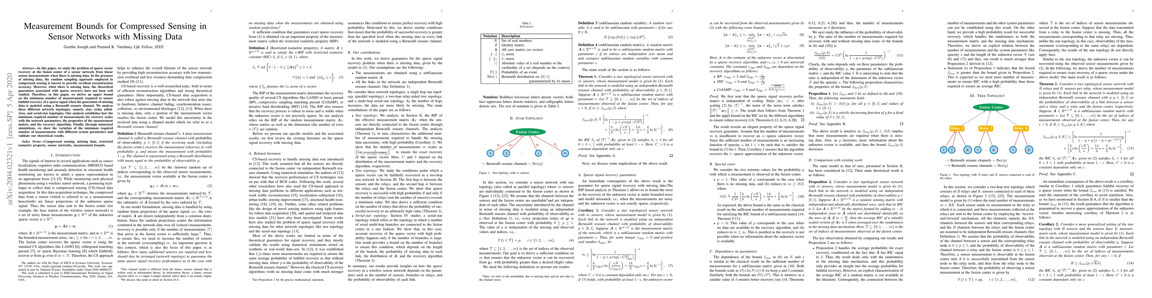 This paper derives an upper bound on the minimum number of measurements needed for accurate sparse signal recovery in sensor networks with missing data, modeled via a Bernoulli erasure channel. It analyzes three network topologies and demonstrates how the required measurements scale with network parameters, measurement matrix properties, and recovery algorithms, validated through numerical simulations.