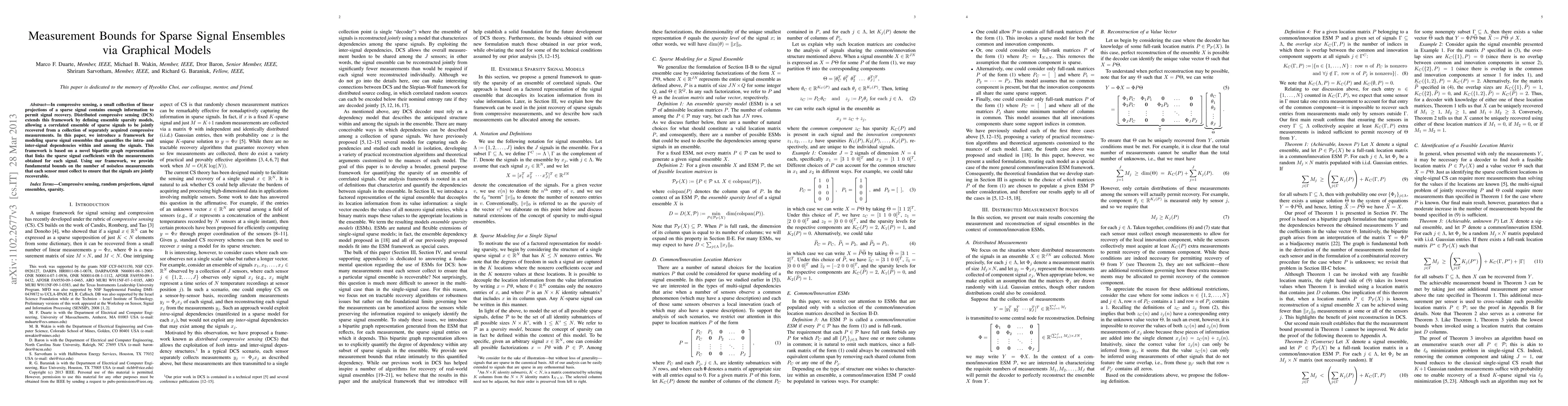 This paper introduces a framework for modeling sparse signal ensembles, providing bounds on the number of noiseless measurements needed to jointly recover correlated signals. It uses a bipartite graph representation to quantify intra- and inter-signal dependencies.