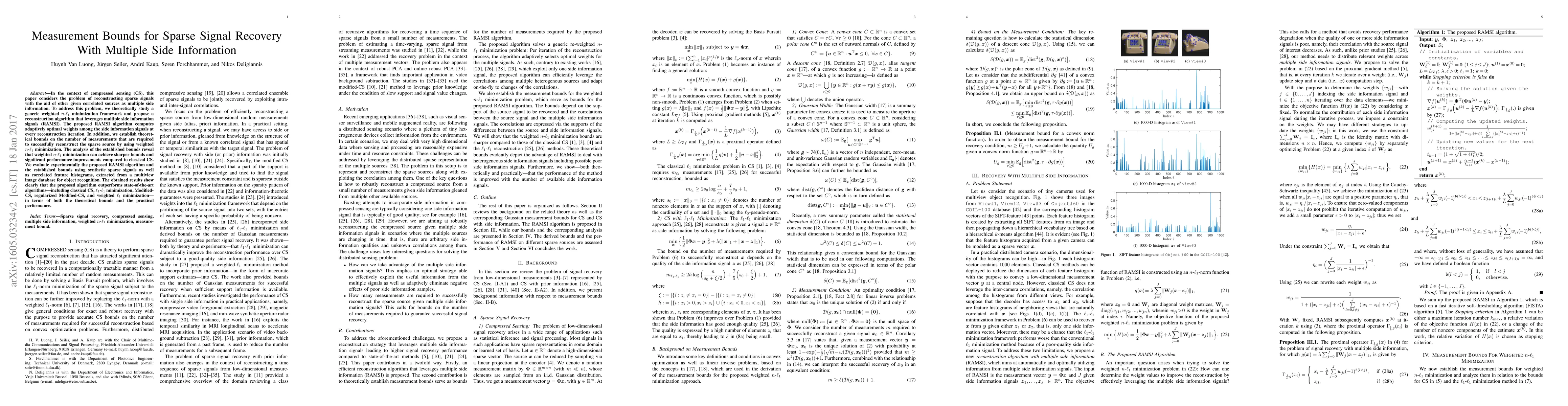 This paper proposes a RAMSI algorithm for reconstructing sparse signals using multiple side information in compressed sensing, establishing theoretical bounds on measurement requirements. Experimental results show that RAMSI outperforms classical CS and other state-of-the-art methods in both theoretical bounds and practical performance.
