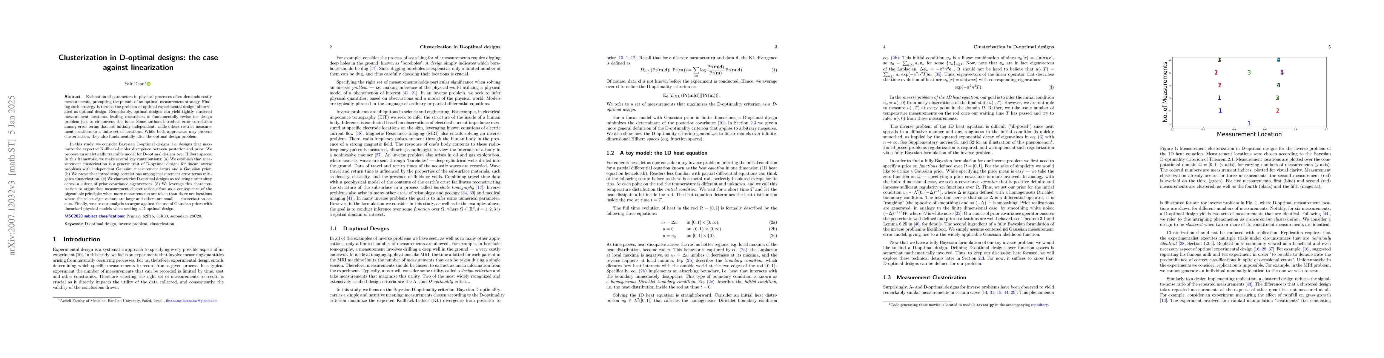 Inversion for parameters of a physical process typically requires taking expensive measurements, and the task of finding an optimal set of measurements is known as the optimal design problem. Surprisingly, measurement locations in optimal designs are sometimes extremely clustered, and researchers often avoid measurement clusterization by modifying the optimal design problem. We consider a certain flavor of the optimal design problem, based on the Bayesian D-optimality criterion, and suggest an analytically tractable model for D-optimal designs in Bayesian linear inverse problems over Hilbert spaces. We demonstrate that measurement clusterization is a generic property of D-optimal designs, and prove that correlated noise between measurements mitigates clusterization. We also give a full characterization of D-optimal designs under our model: We prove that D-optimal designs uniformly reduce uncertainty in a select subset of prior covariance eigenvectors. Finally, we show how measurement clusterization is a consequence of the characterization mentioned above and the pigeonhole principle.
