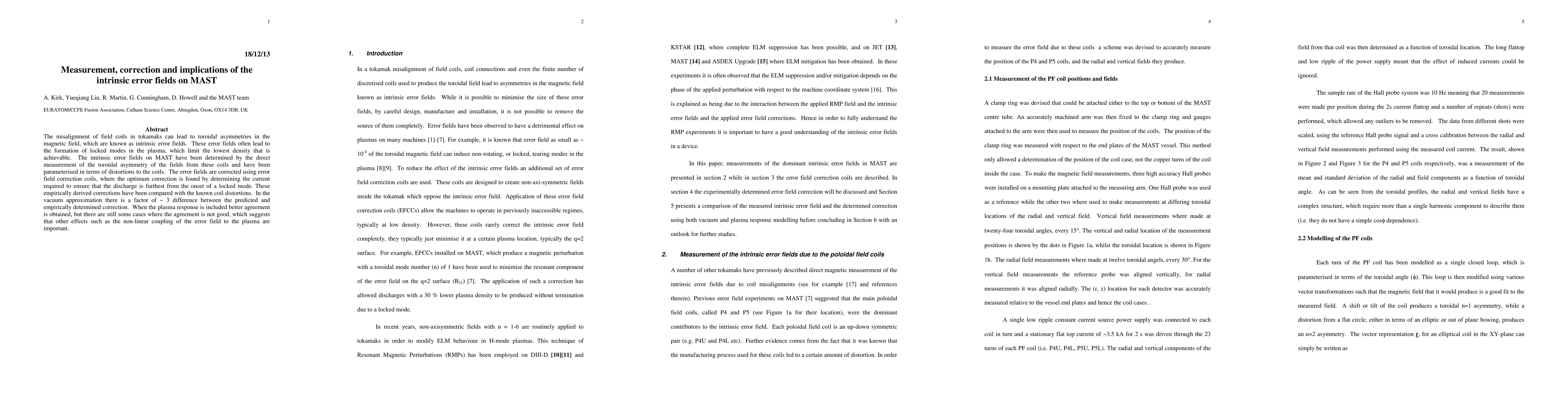 This paper measures and corrects intrinsic error fields on MAST tokamak due to field coil misalignments, which cause toroidal asymmetries and locked modes. The correction is optimized to prevent locked modes, but discrepancies between predicted and empirical corrections suggest non-linear plasma effects play a role.