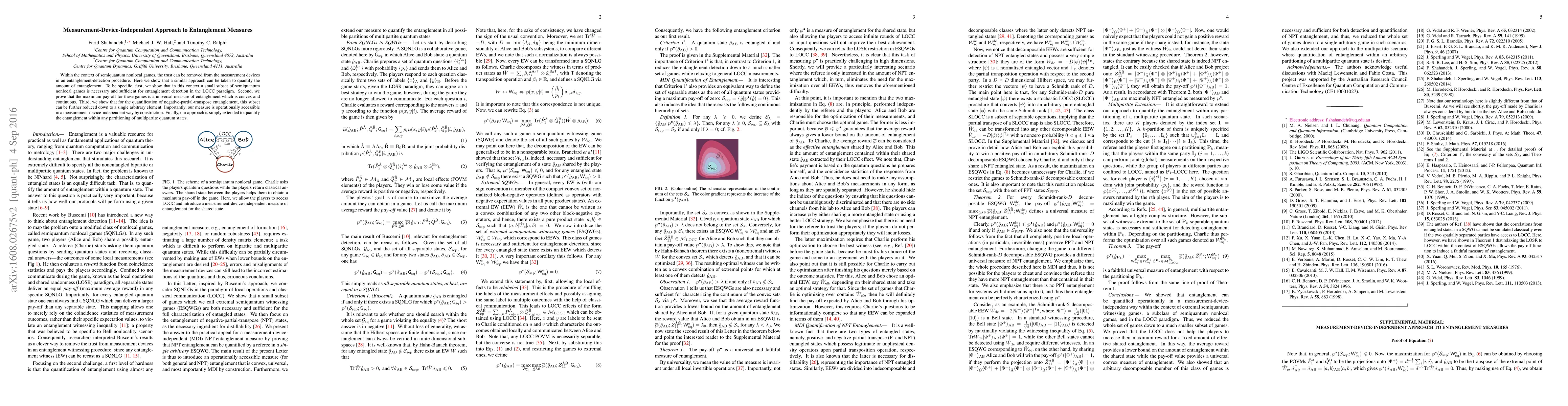Within the context of semiquantum nonlocal games, the trust can be removed from the measurement devices in an entanglement-detection procedure. Here we show that a similar approach can be taken to quantify the amount of entanglement. To be specific, first, we show that in this context a small subset of semiquantum nonlocal games is necessary and sufficient for entanglement detection in the LOCC paradigm. Second, we prove that the maximum pay-off for these games is a universal measure of entanglement which is convex and continuous. Third, we show that for the quantification of negative-partial-transpose entanglement, this subset can be further reduced down to a single arbitrary element. Importantly, our measure is operationally accessible in a measurement-device-independent way by construction. Finally, our approach is simply extended to quantify the entanglement within any partitioning of multipartite quantum states.
