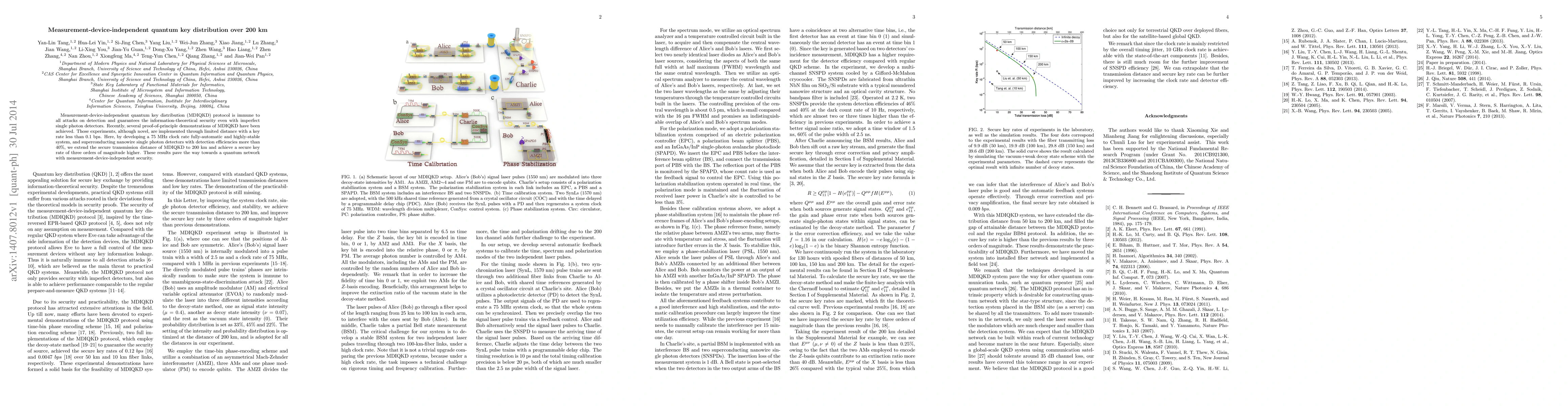 Measurement-device-independent quantum key distribution (MDIQKD) protocol is immune to all attacks on detection and guarantees the information-theoretical security even with imperfect single photon detectors. Recently, several proof-of-principle demonstrations of MDIQKD have been achieved. Those experiments, although novel, are implemented through limited distance with a key rate less than 0.1 bps. Here, by developing a 75 MHz clock rate fully-automatic and highly-stable system, and superconducting nanowire single photon detectors with detection efficiencies more than 40%, we extend the secure transmission distance of MDIQKD to 200 km and achieve a secure key rate of three orders of magnitude higher. These results pave the way towards a quantum network with measurement-device-independent security.
