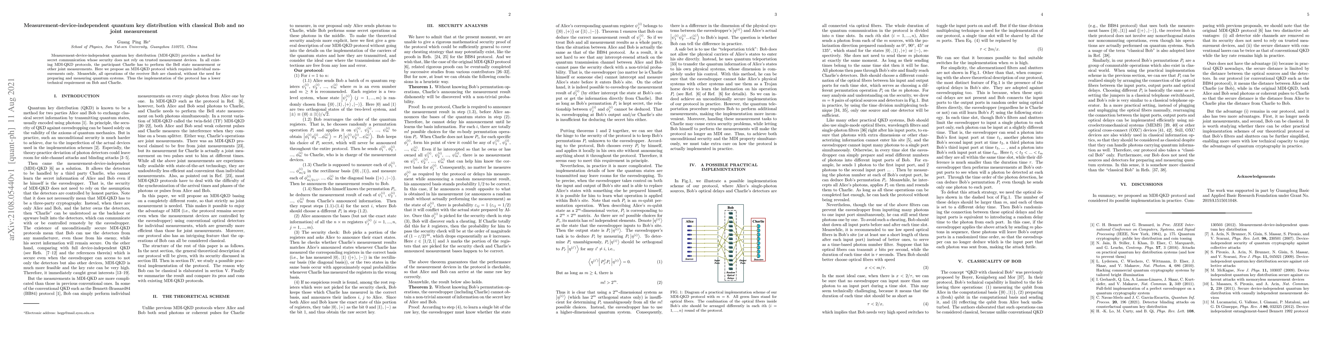 This paper proposes a novel measurement-device-independent quantum key distribution (MDI-QKD) protocol where only individual measurements are required, eliminating the need for joint measurements by Charlie. Additionally, Bob's operations are entirely classical, significantly reducing the technical complexity for both participants.