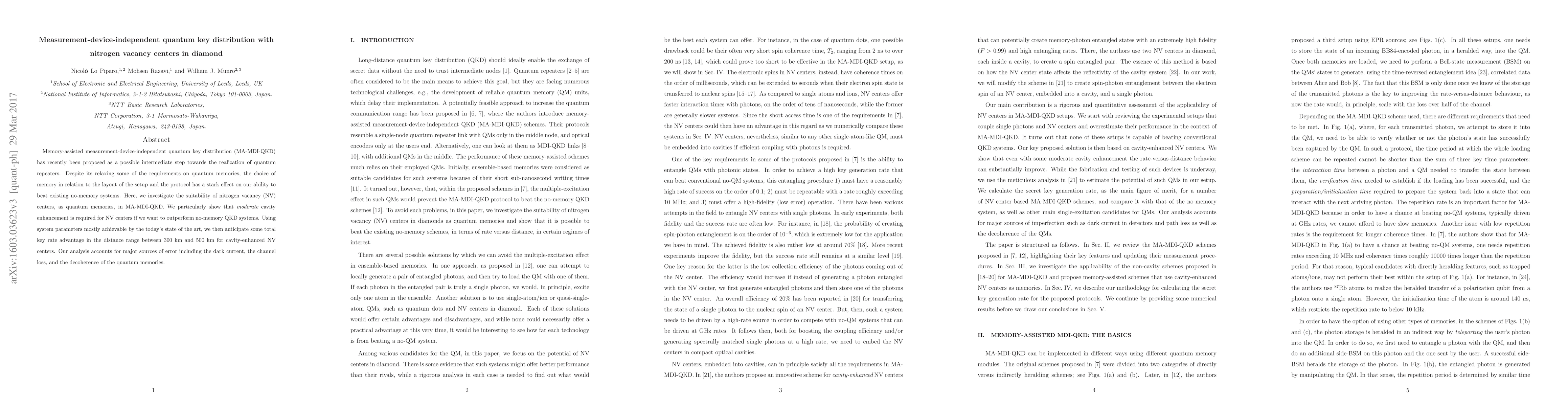 This paper explores the use of nitrogen vacancy (NV) centers in diamond as quantum memories for memory-assisted measurement-device-independent quantum key distribution (MA-MDI-QKD), finding that moderate cavity enhancement is necessary to outperform no-memory systems, with a potential key rate advantage over 300 km to 500 km. The analysis considers factors like dark current, channel loss, and quantum memory decoherence.