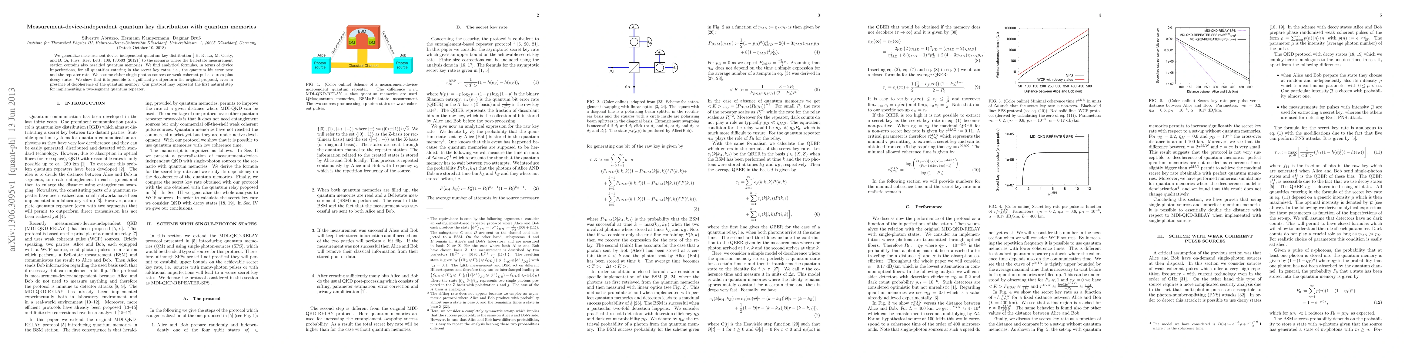 We generalize measurement-device-independent quantum key distribution [ H.-K. Lo, M. Curty, and B. Qi, Phys. Rev. Lett. 108, 130503 (2012) ] to the scenario where the Bell-state measurement station contains also heralded quantum memories. We find analytical formulas, in terms of device imperfections, for all quantities entering in the secret key rates, i.e., the quantum bit error rate and the repeater rate. We assume either single-photon sources or weak coherent pulse sources plus decoy states. We show that it is possible to significantly outperform the original proposal, even in presence of decoherence of the quantum memory. Our protocol may represent the first natural step for implementing a two-segment quantum repeater.