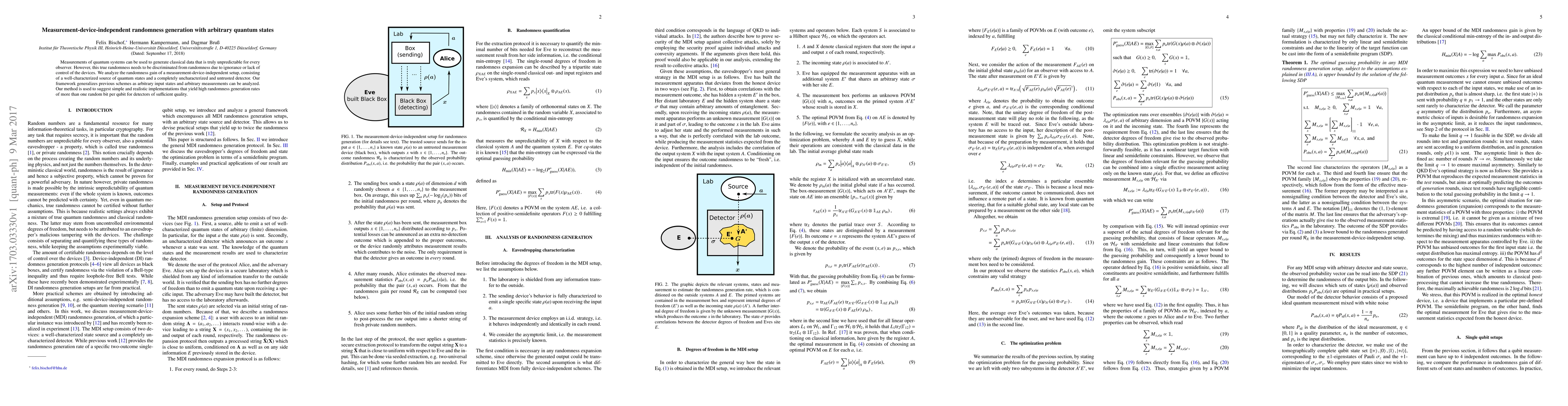 This paper proposes a measurement-device-independent method for generating true randomness from quantum states, ensuring unpredictability regardless of device control. It generalizes previous schemes to accommodate any input states and measurements, achieving high randomness rates of over one random bit per qubit for sufficiently good detectors.