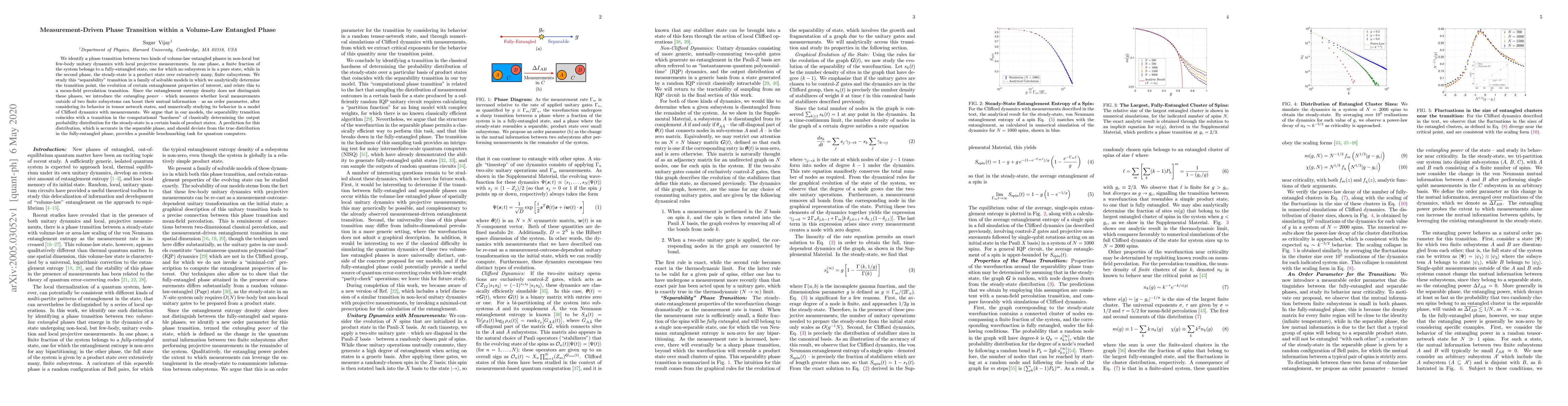 Researchers discovered a phase transition between two types of volume-law entangled phases in non-local quantum systems, where measurements can distinguish between them. This finding has implications for the development of quantum computers, as it could provide a benchmarking task to measure their computational hardness.