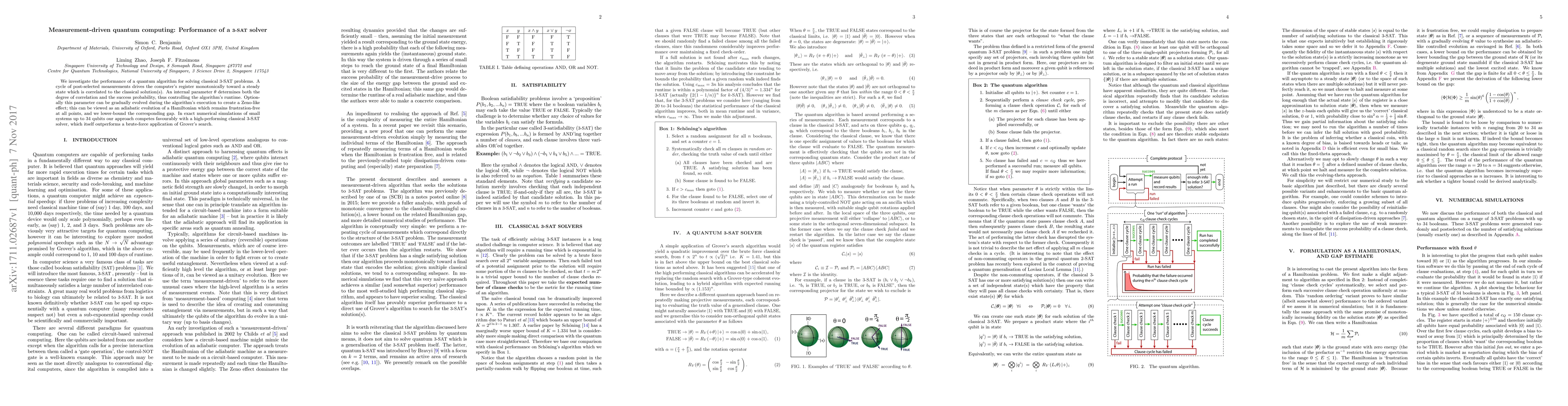 We investigate the performance of a quantum algorithm for solving classical 3-SAT problems. A cycle of post-selected measurements drives the computer's register monotonically toward a steady state which is correlated to the classical solution(s). An internal parameter $\theta$ determines both the degree of correlation and the success probability, thus controlling the algorithm's runtime. Optionally this parameter can be gradually evolved during the algorithm's execution to create a Zeno-like effect; this can be viewed as an adiabatic evolution of a Hamiltonian which remains frustration-free at all points, and we lower-bound the corresponding gap. In exact numerical simulations of small systems up to 34 qubits our approach competes favourably with a high-performing classical 3-SAT solver, which itself outperforms a brute-force application of Grover's search.