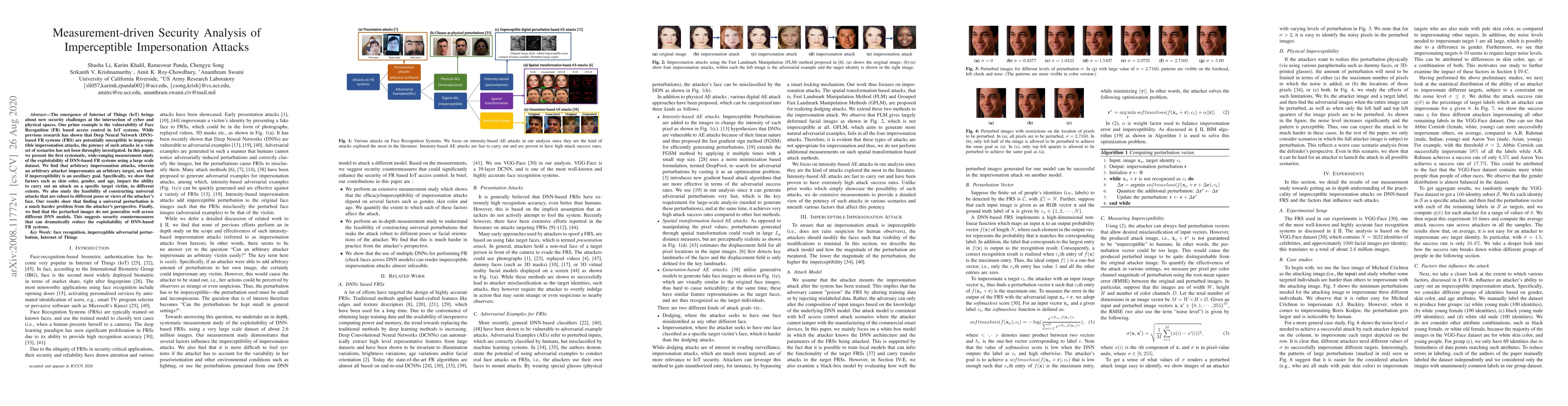 Researchers found that deep neural network-based face recognition systems are vulnerable to impersonation attacks when imperceptibility is a goal, but constructing universal attacks is challenging, and security countermeasures can reduce exploitability.
