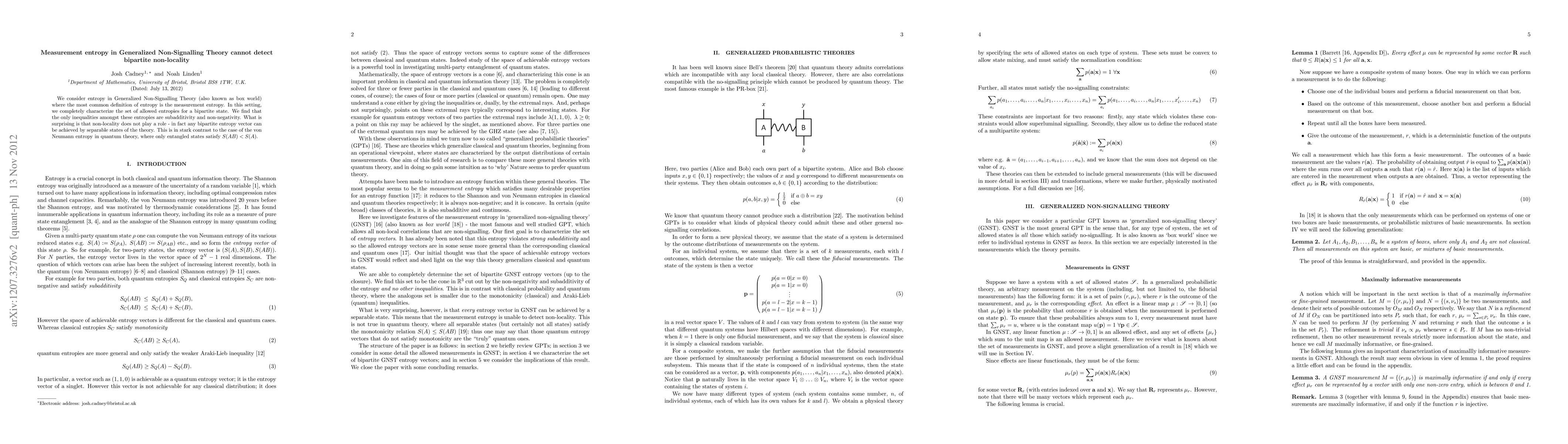 Measuring bipartite non-locality is impossible in Generalized Non-Signalling Theory due to the lack of a relationship between entropies, allowing any bipartite state to be represented by separable states.