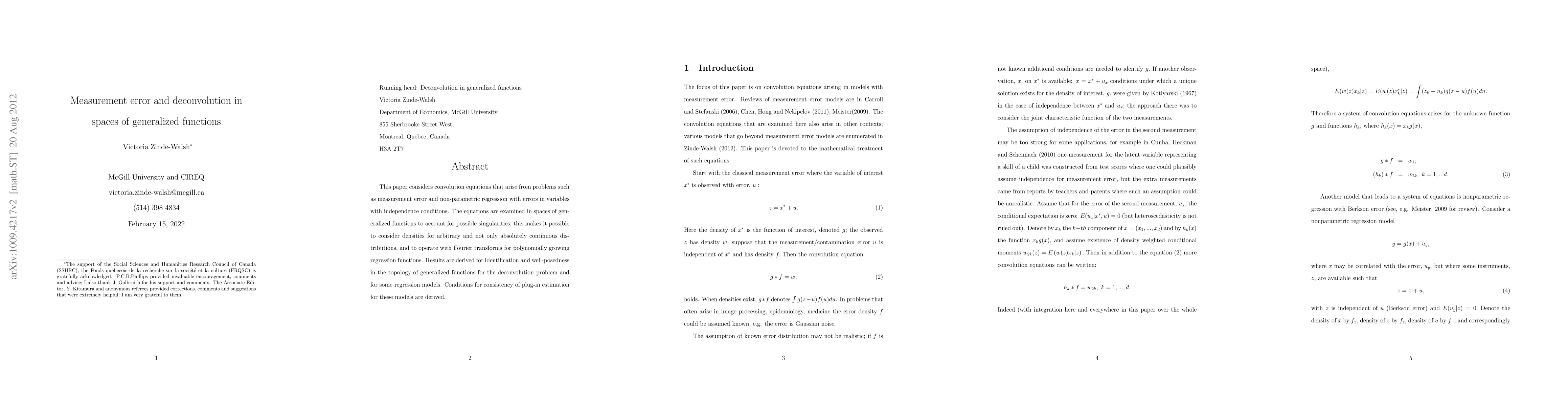 This paper addresses convolution equations arising from measurement error and non-parametric regression, analyzing them in the context of generalized functions to handle singularities. It provides results on identification and well-posedness for the deconvolution problem and certain regression models, with conditions for the consistency of plug-in estimation.