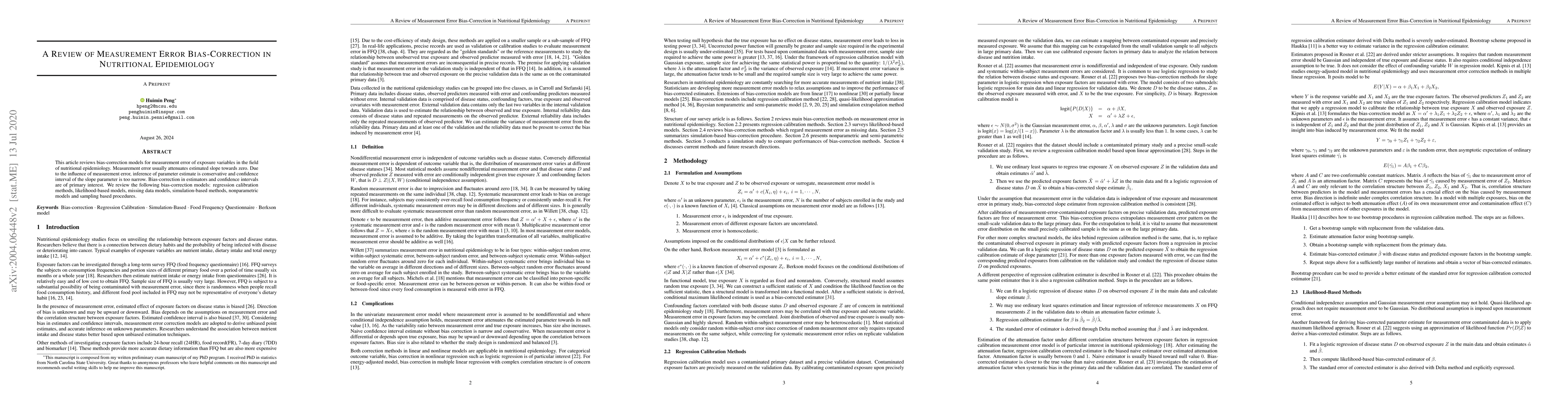 This paper surveys various bias-correction models for measurement error in nutritional epidemiology, highlighting how measurement error typically attenuates estimates and narrows confidence intervals. It reviews methods including regression calibration, likelihood-based, missing data, simulation-based, nonparametric, and sampling-based approaches.