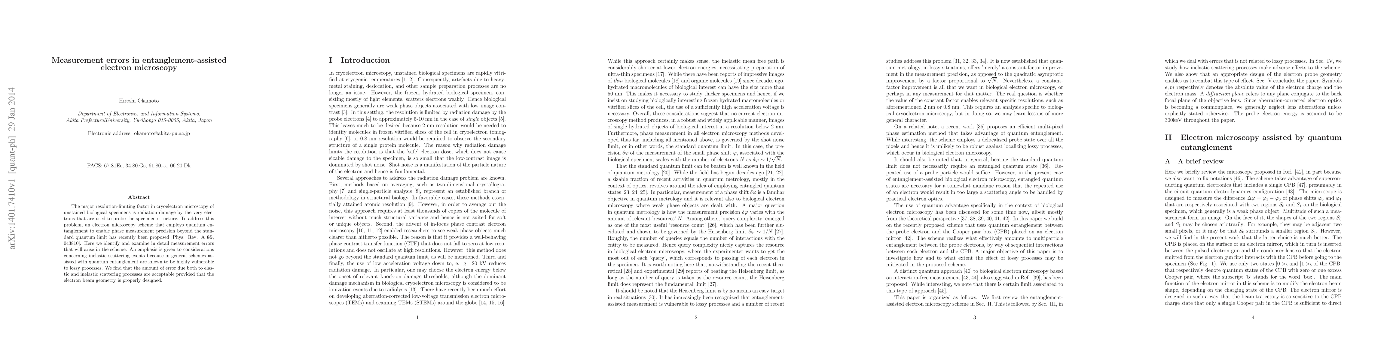 This paper investigates measurement errors in a proposed entanglement-assisted electron microscopy technique designed to overcome radiation damage in cryoelectron microscopy. It finds that errors from both elastic and inelastic scattering are acceptable if the electron beam geometry is carefully optimized.