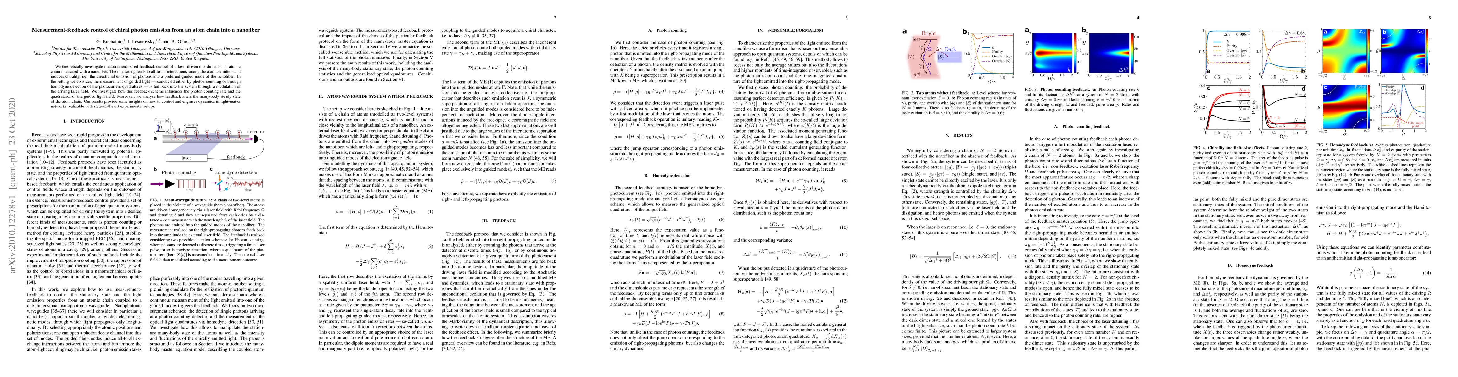 This paper explores the theoretical framework for measurement-feedback control of chiral photon emission from a laser-driven atomic chain interfaced with a nanofiber, demonstrating how feedback on the guided light can influence photon emission rates and the many-body dynamics of the atomic chain. The findings offer insights into controlling light-matter interactions in advanced experimental setups.