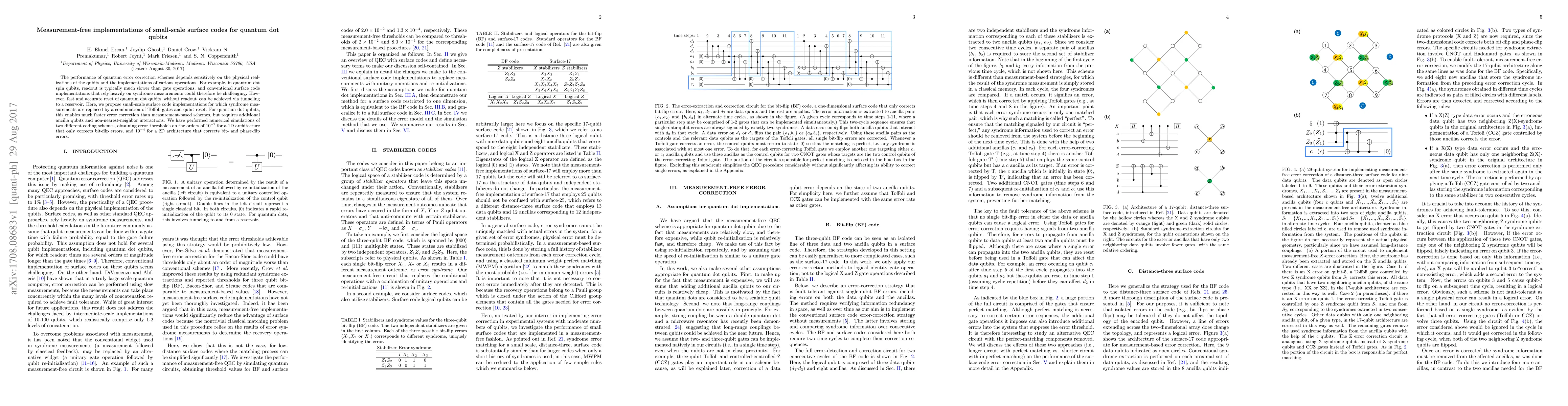 This paper proposes measurement-free implementations of small-scale surface codes for quantum dot qubits, replacing syndrome measurements with Toffoli gates and qubit reset, achieving faster error correction with additional ancilla qubits and non-nearest-neighbor interactions. Numerical simulations show error thresholds of $10^{-2}$ for 1D bit-flip correction and $10^{-4}$ for 2D bit- and phase-flip correction.