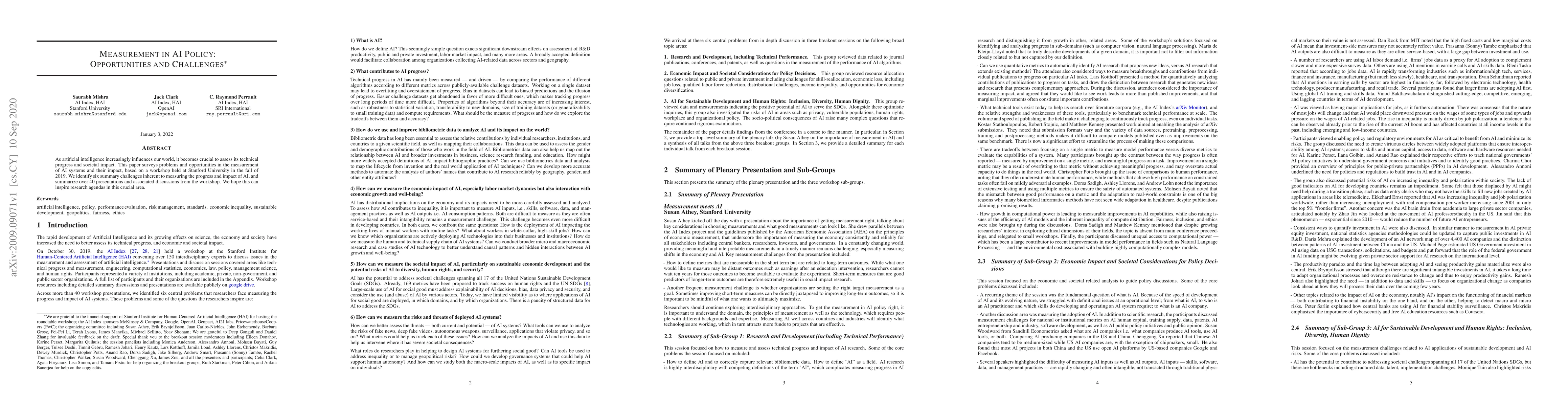 As artificial intelligence increasingly influences our world, it becomes crucial to assess its technical progress and societal impact. This paper surveys problems and opportunities in the measurement of AI systems and their impact, based on a workshop held at Stanford University in the fall of 2019. We identify six summary challenges inherent to measuring the progress and impact of AI, and summarize over 40 presentations and associated discussions from the workshop. We hope this can inspire research agendas in this crucial area.