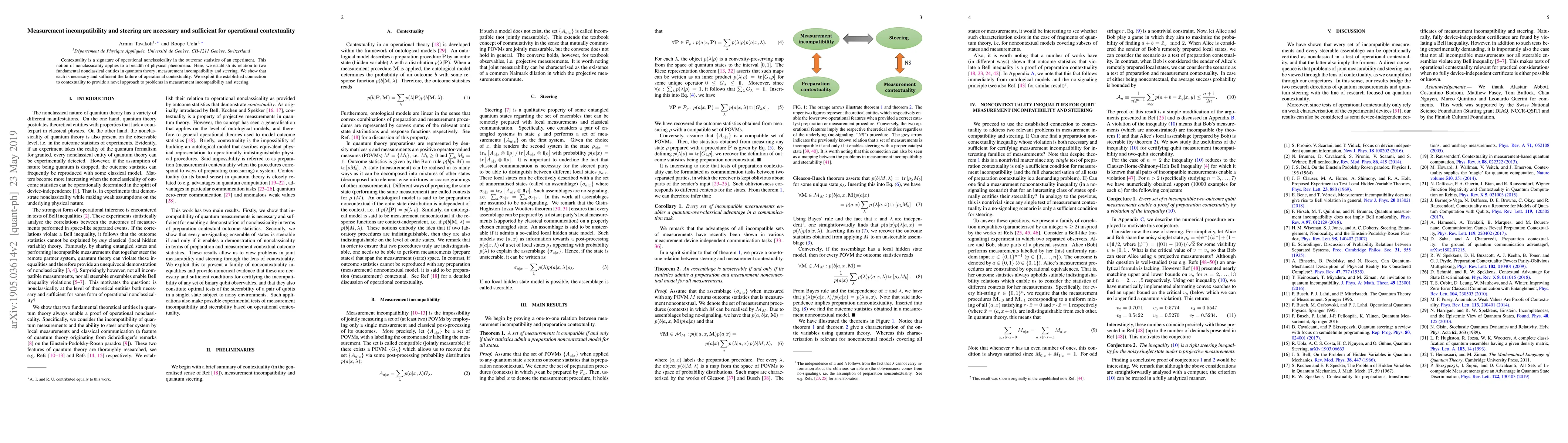This paper demonstrates that measurement incompatibility and steering are both necessary and sufficient conditions for operational contextuality, providing a new framework for addressing issues related to measurement incompatibility and steering in quantum theory.