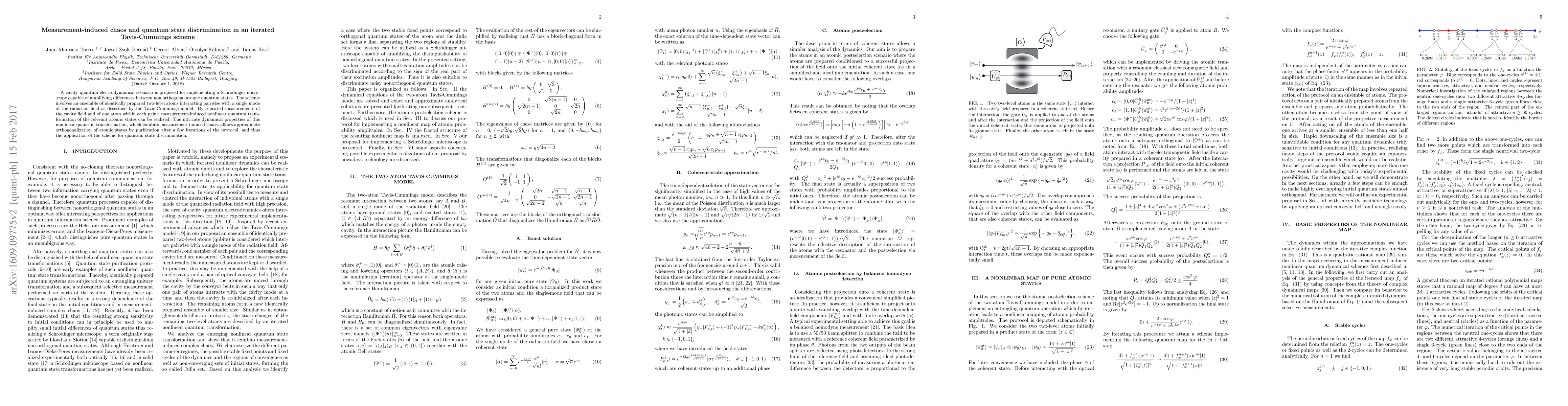 A cavity quantum electrodynamical scenario is proposed for implementing a Schr\"odinger microscope capable of amplifying differences between non orthogonal atomic quantum states. The scheme involves an ensemble of identically prepared two-level atoms interacting pairwise with a single mode of the radiation field as described by the Tavis-Cummings model. By repeated measurements of the cavity field and of one atom within each pair a measurement-induced nonlinear quantum transformation of the relevant atomic states can be realized. The intricate dynamical properties of this nonlinear quantum transformation, which exhibits measurement-induced chaos, allows approximate orthogonalization of atomic states by purification after a few iterations of the protocol, and thus the application of the scheme for quantum state discrimination.