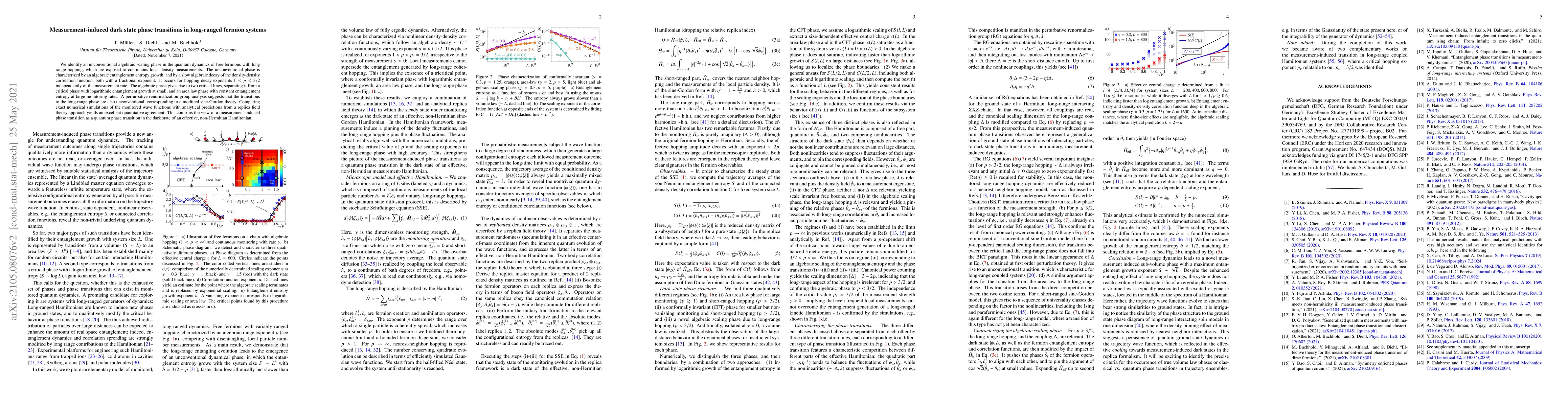 We identify an unconventional algebraic scaling phase in the quantum dynamics of free fermions with long range hopping, which are exposed to continuous local density measurements. The unconventional phase is characterized by an algebraic entanglement entropy growth, and by a slow algebraic decay of the density-density correlation function, both with a fractional exponent. It occurs for hopping decay exponents $1< p \lesssim 3/2$ independently of the measurement rate. The algebraic phase gives rise to two critical lines, separating it from a critical phase with logarithmic entanglement growth at small, and an area law phase with constant entanglement entropy at large monitoring rates. A perturbative renormalization group analysis suggests that the transitions to the long-range phase are also unconventional, corresponding to a modified sine-Gordon theory. Comparing exact numerical simulations of the monitored wave functions with analytical predictions from a replica field theory approach yields an excellent quantitative agreement. This confirms the view of a measurement-induced phase transition as a quantum phase transition in the dark state of an effective, non-Hermitian Hamiltonian.