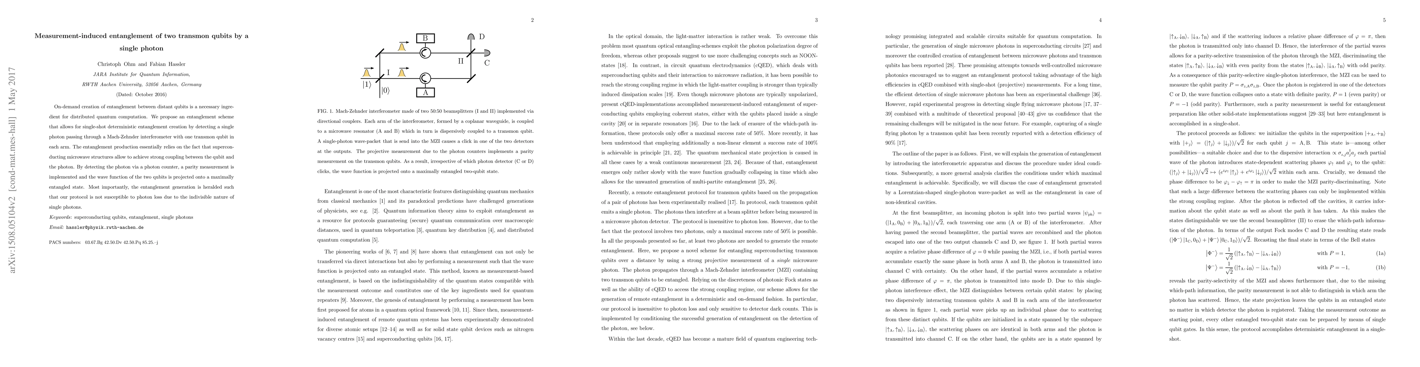 This paper proposes a method for creating entanglement between two transmon qubits using a single photon detected in a Mach-Zehnder interferometer. The entanglement is achieved through a parity measurement, ensuring a maximally entangled state, and is heralded by the photon detection, making it robust against photon loss.